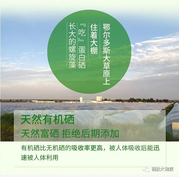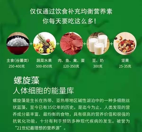螺旋藻属微藻类植物,仅在热带高温、阳光直射及高pH值的碱性盐水下生长,在地球上已有三十五亿年的历史,是地球上最古老的植物之一,但它却是当代所发现的含惊人营养价值的碱性健康食品。螺旋藻比其它任何食物含有更丰富、更均衡、更易被人体消化吸收的植物蛋白质、各种维生素、矿物质、叶绿素、 3-次亚麻油酸等不饱和脂肪酸和 2-胡萝卜素等,它含有8种人体不能合成的氨基酸,与联合国粮农组织(FAO)的标准几乎一致。