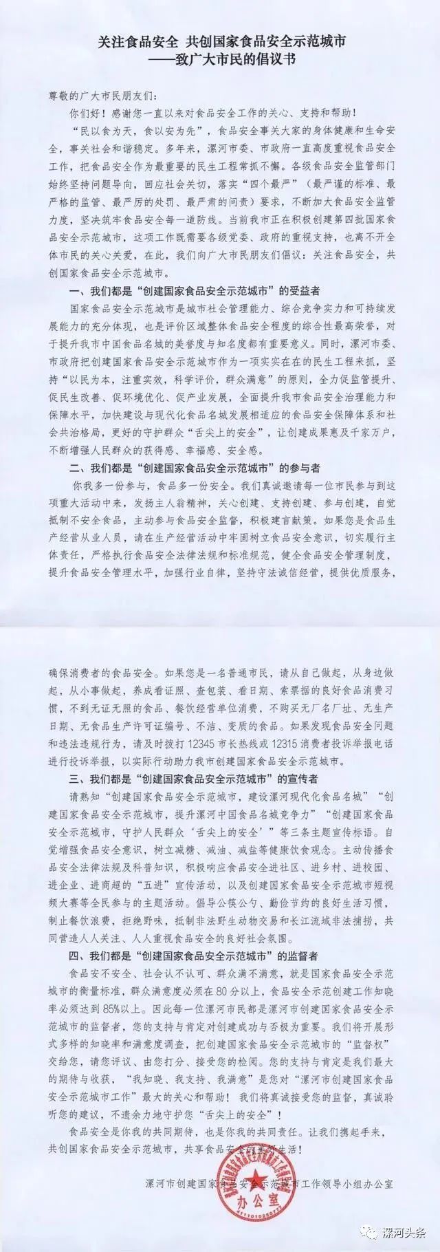 “民以食为天,食以安为先”,食品安全事关大家的身体健康和生命安全,事关社会和谐稳定。多年来,漯河市委、市政府一直高度重视食品安全工作,把食品安全作为最重要的民生工程常抓不懈。各级食品安全监管部门始终坚持问题导向,回应社会关切,落实“四个最严”(最严谨的标准、最严格的监管、最严厉的处罚、最严肃的问责)要求,不断加大食品安全监管力度,坚决筑牢食品安全每一道防线。当前我市正在积极创建第四批国家食品安全示范城市,这项工作既需要各级党委、政府的重视支持,也离不开全体市民的关心关爱,在此,我们向广大市民朋友们倡议:关注食品安全,共创国家食品安全示范城市。
