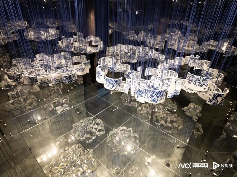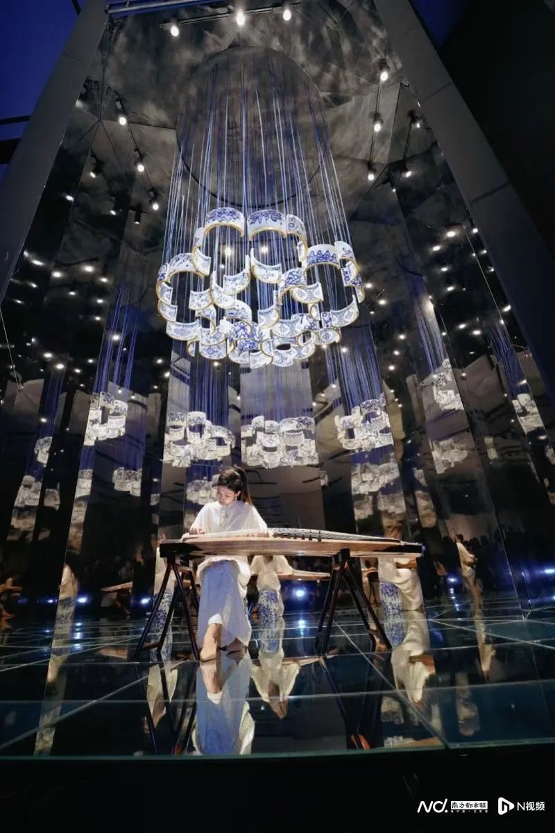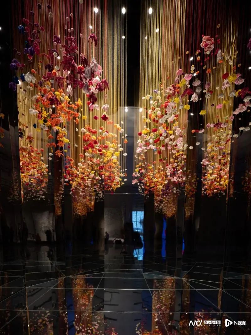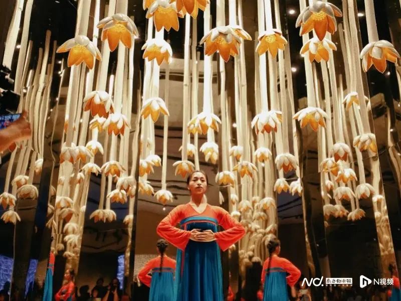 《花的精神》是由三个艺术场景空间组成,其中的《绒之百花·春之镜像》空间里的缤纷垂落的绒线花束下,与《莲之镜像》中垂落的陶瓷莲花下,两位舞者同时上演了双独舞作品《俑Ⅲ-唐乐宫图》。此段舞蹈由北京舞蹈学院田湉编舞,取材于中国古代历史名画,不同的空间造型和近距离欣赏的观感给观众带来与剧院大舞台中欣赏舞剧完全不同的感受。之后在另一边的《花的三重境》空间中,湖南师范大学的丁雪纯在摇摆的青花瓷片作品下演奏了一曲古筝协奏曲《秋韵》,乐曲在瓷片中恣意流淌,带观者一同进入秋实景象。
