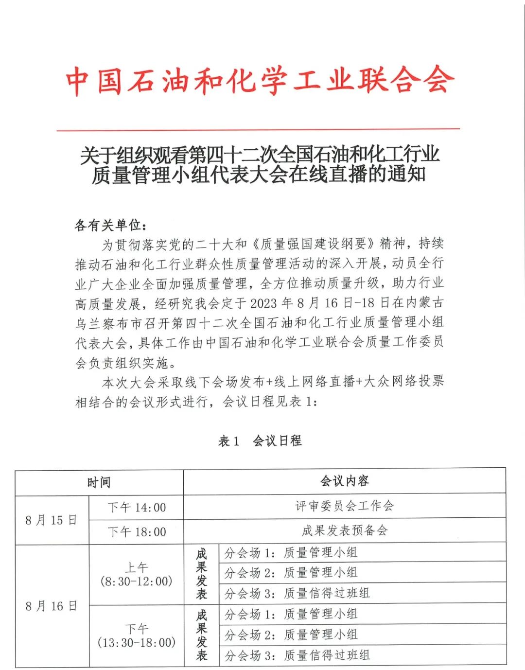 关于组织观看第四十二次全国石油和化工行业质量管理小组代表大会在线直播的通知