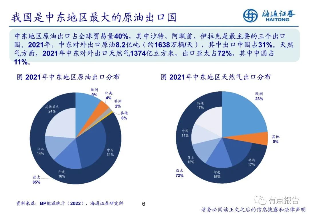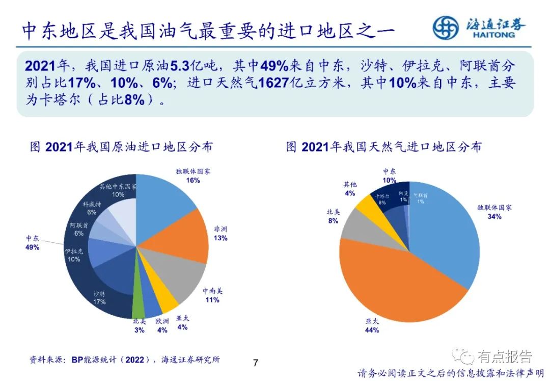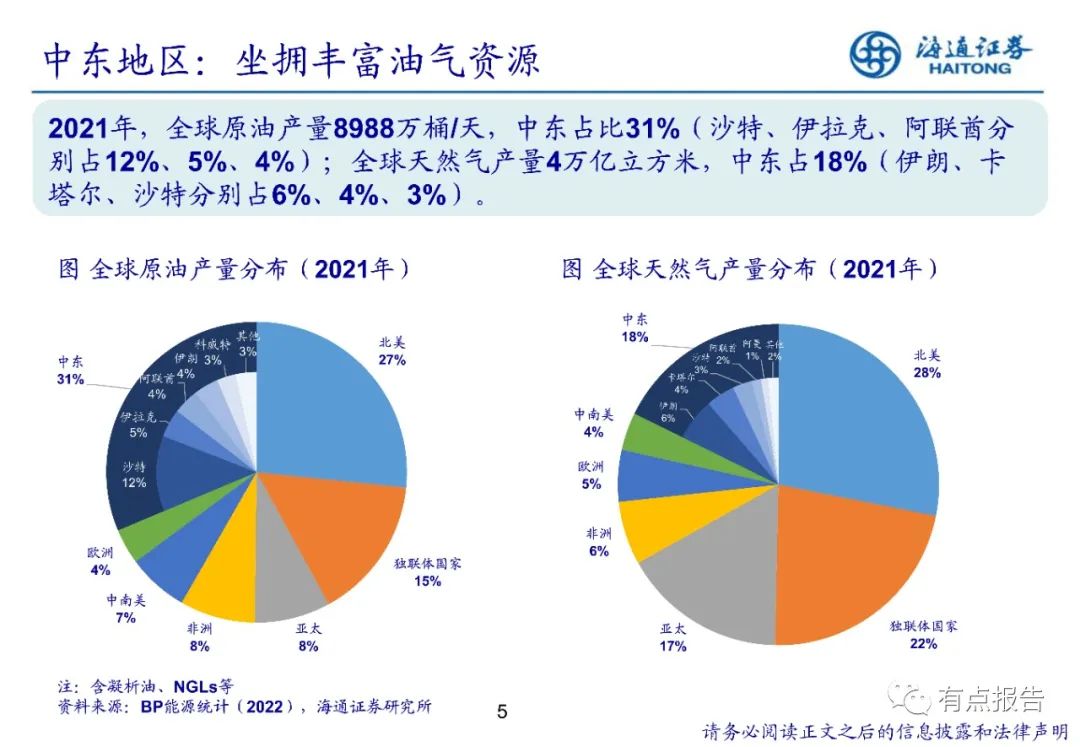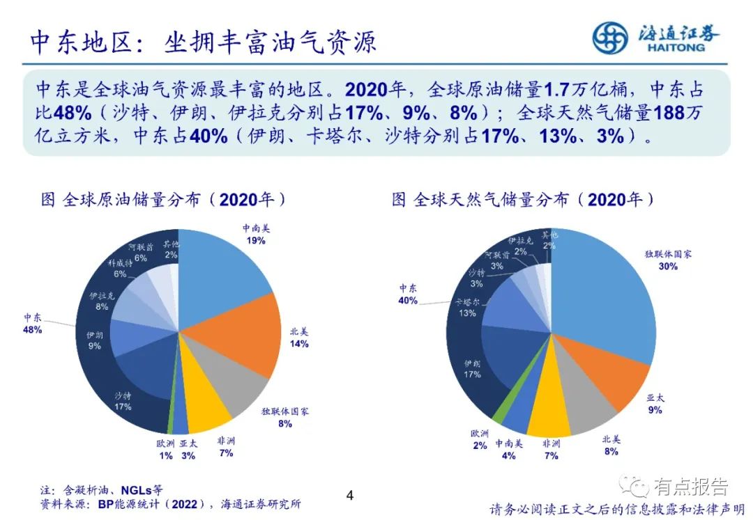 中东是全球油气资源最丰富的地区。2020年,全球原油储量1.7万亿桶,中东占比48%(沙特、伊朗、伊拉克分别占17%、9%、8%);全球天然气储量188万亿立方米,中东占40%(伊朗、卡塔尔、沙特分别占17%、13%、3%)。