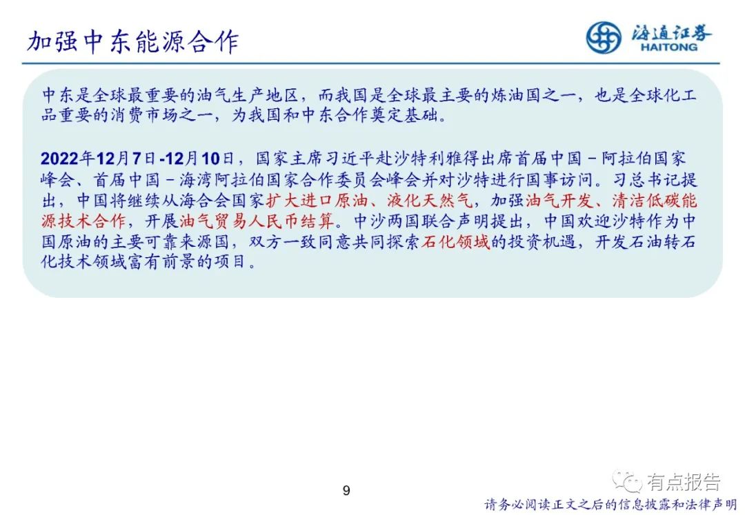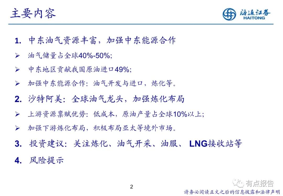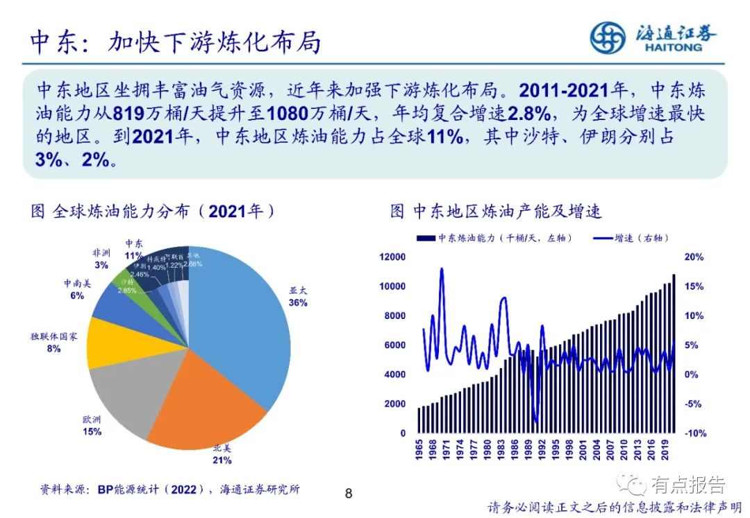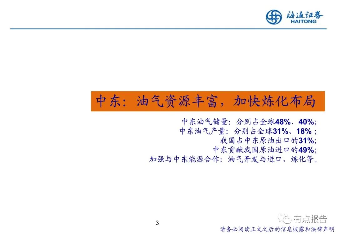 中东是全球油气资源最丰富的地区。2020年,全球原油储量1.7万亿桶,中东占比48%(沙特、伊朗、伊拉克分别占17%、9%、8%);全球天然气储量188万亿立方米,中东占40%(伊朗、卡塔尔、沙特分别占17%、13%、3%)。