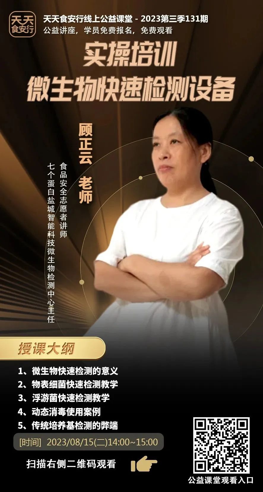 2023年08月15日下午14:00-15:00,天天食安行·公益大讲堂:食品安全志愿者讲师 、七个蛋白盐城智能科技微生物检测中心主任 顾正云老师,给大家分享《实操培训,微生物快速检测设备》。点击下图长按“识别图中的二维码”,提前登记、预约直播课程。公益讲座,不收取任何费用。