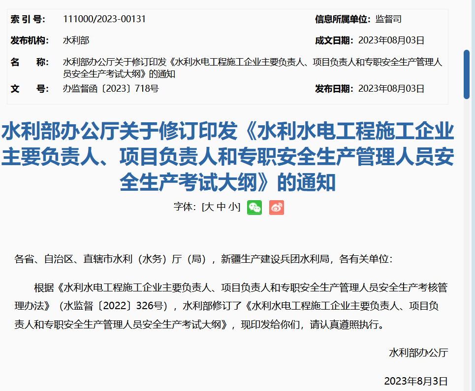 http://www.mwr.gov.cn/zwgk/gknr/202308/t20230809_1678449.html水利部办公厅关于修订印发《水利水电工程施工企业主要负责人、项目负责人和专职安全生产管理人员安全生产考试大纲》的通知各省、自治区、直辖市水利(水务)厅(局),新疆生产建设兵团水利局,各有关单位: 根据《水利水电工程施工企业主要负责人、项目负责人和专职安全生产管理人员安全生产考核管理办法》(水监督〔2022〕326号),水利部修订了《水利水电工程施工企业主要负责人、项目负责人和专职安全生产管理人员安全生产考试大纲》,现印发给你们,请认真遵照执行。水利水电工程施工企业主要负责人、项目负责人和专职安全生产管理人员安全生产考试大纲 1.0.1 根据《水利水电工程施工企业主要负责人、项目负责人和专职安全生产管理人员安全生产考核管理办法》(水监督〔2022〕326号)要求制定本大纲。 1.0.2 本大纲规定了水利水电工程施工企业主要负责人、项目负责人和专职安全生产管理人员(以下统称安管人员)的安全生产考试内容和要求,适用于安管人员的安全生产考试。 2.1.1 安全生产考试内容包括安全生产知识和管理能力两部分。2.1.2 安全生产知识主要包括安全生产相关法规政策和安全生产技术。