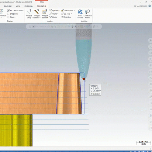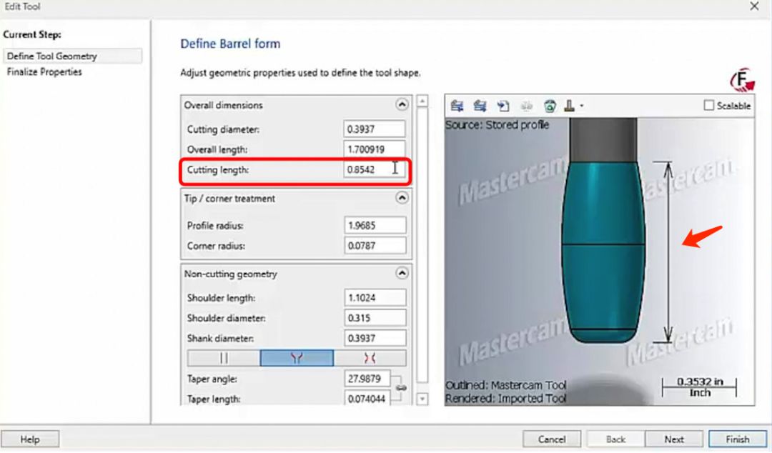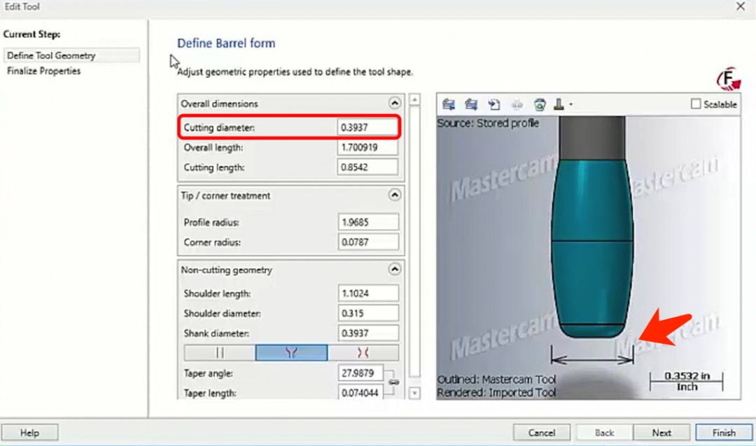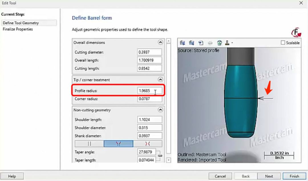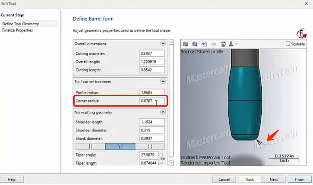 在下面视频展示的加工案例中,整体精加工时间节约了 93%:CNC精加工的目的是保证工件的最终尺寸精度和表面质量。而精加工的表面质量,很大程度取决于加工后留下的残脊高度。残脊高度是指加工中刀具通过两条相邻刀具路径之后,残留材料凸起部分的最大高度,如下图所示。一个可行的方法是减小步距,减小相邻刀路之间的距离。但这意味着增加了单位面积中的刀路数量和密度,增加了精加工的时间。另一个可行的方法是使用更大的刀具。因为刀具半径越大,与材料接触时接触点上的弧度越大。在相同刀路密度下,得到的残脊高度约小。用大半径的刀具可以减小残脊高度,达到更好的表面质量,但很多工件需要精加工的地方,间隙狭小不能用大半径刀具加工。大圆弧刀具是一类新型的铣削刀具。使用大圆弧刀具则可以用更大的步进量来达到同样的表面质量。刀路编程是有效使用大圆弧刀具的关键,在刀路中控制刀具以适当的角度与工件轮廓形状进行精确拟合,可以在保证表面质量的前提下大幅减少加工循环时间,这就是Mastercam的超弦精加工技术。球刀的优点是在使用时不用考虑刀尖形状与工件表面形状的啮合角度,无论使用何种角度,刀尖接触点的形状始终是圆形。但是,球刀需要较小的步进增量来保证精加工表面质量,被加工表面较大时,加工时间会变的非常长。通过使用比球刀大的多的刀尖圆弧,也就是使用锥度型式或椭圆型式刀具,在不增加刀路密度的情况下可以减小残脊高度,在更少的时间内可以完成质量更高的精加工。Mastercam的超弦精加工技术是对于使用圆弧刀具进行高效精加工的编程解决方案。可以针对各种形状的大圆弧刀具,基于刀具形状,通过特殊刀路算法,对加工过程中的刀具接触点进行动态补偿,可以充分利用圆弧刀具的外形进行高精度高效率的精加工。要想以超弦精加工方式使用大圆弧刀具进行精加工,应该选择怎样的刀路策略进行编程呢?在普通 3 轴加工中,因为机床轴运动简单,可以利用超弦精加工进行一些侧壁和陡峭区域或顶面平缓区域的精加工。推荐选用圆桶形式和锥度形式的圆弧刀具,使用 Mastercam 3D精加工中的等高策略和平行策略进行超弦精加工。在刀具管理器中选择圆桶形式刀具;在刀具定义页面,设置圆桶刀具的各项外形参数。这里定义的刀具外形设置的参数,会直接影响到刀路运算结果。最稳妥的方式,还是直接导入刀具厂商提供的刀具模型。通过切削验证可以看到,Mastercam 生成的超弦精加工刀路,利用了刀具的大圆弧,以比使用球刀大的多步距,高效的进行精加工。在这个案例中,选用圆桶形式圆弧刀具使用等高策略进行加工。仔细观察生成的超弦精加工刀路,充分利用了圆桶刀具的大圆弧进行精加工。在 3+2 定面的环境中进行超弦精加工,同样推荐使用等高与平行策略。与单纯的 3 轴加工不一样的是,3+2 定面加工中,需要选择合适的刀具平面,使刀具的圆弧在刀路中以稳定的切点与材料接触。五轴联动加工机床运动的角度灵活,是超弦精加工的主要应用领域。在五轴加工中,推荐使用平行和渐变加工策略。以五轴联动方式进行超弦精加工,其关键点是控制刀轴,使刀具以稳定合适的圆弧切点与材料接触。超弦精加工适用于3轴加工、3+2轴定面加工、五轴联动加工。