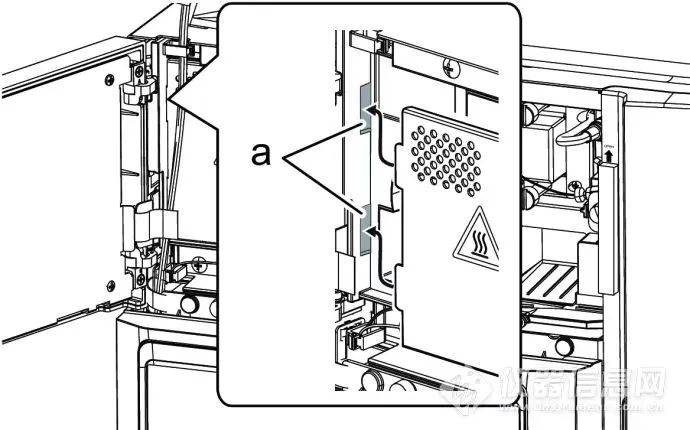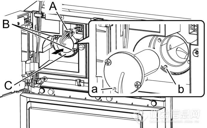 3. 拆下连接器(A)。使用十字螺丝刀拧松D2灯固定螺丝(B、2个),拆下D2灯(C)。4. 将新D2灯(C)的缺口(a)对准定位针(b),使用十字螺丝刀交替拧紧D2灯固定螺丝(B、2个)。5. 安装连接器(A)。将灯罩插入框架的狭缝(a)。拧紧灯罩安装螺丝(A),安装灯罩(B)。关闭控制器面板。6. 打开 (电源按钮)。仪器启动,输入登录通行ID Number并按下[OK]后,将显示[D2 lamp replacement]窗口。