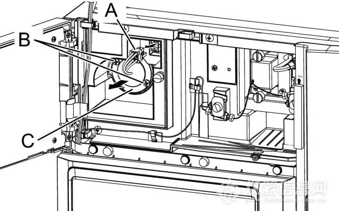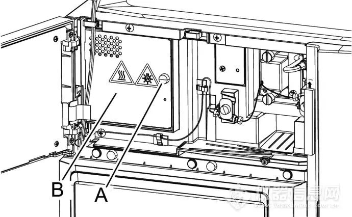1. 在[Replacement Parts Selection]窗口中按下[D2 Lamp],按下[Power OFF]。按下[OK]后将关闭仪器电源,关闭后待氘灯冷却30min后方可进行氘灯更换。(只有按照此步骤更换氘灯,使用时长才会归零)2. 打开控制器面板。拧松灯罩安装螺丝(A),拆下灯罩(B)。