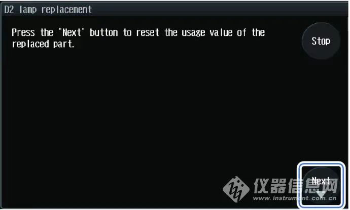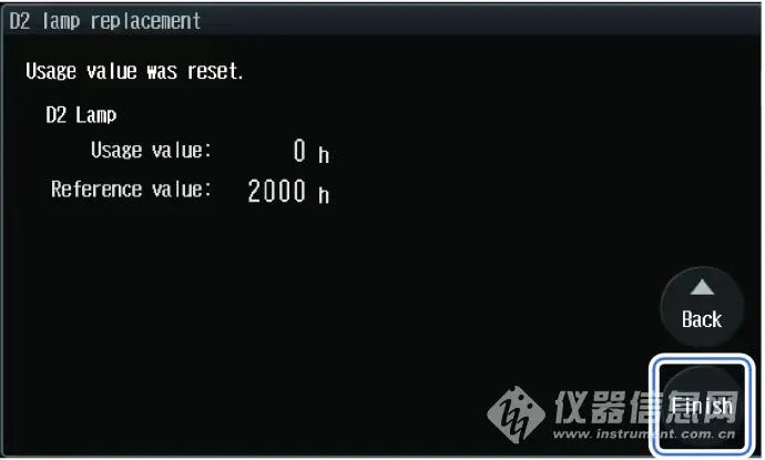 7. 选择[Next]。显示下一窗口,使用值将复位。将在维护日志中记录更换信息。确认使用值已复位后,按下[Finish]。这就是岛津2030C液相氘灯更换的过程,希望对各位网友有所帮助。