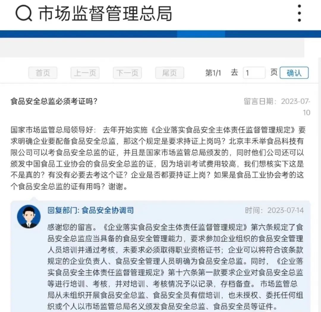 答:感谢您的留言。《企业落实食品安全主体责任监督管理规定》第六条规定了食品安全总监应当具备的食品安全管理能力,要求参加企业组织的食品安全管理人员培训并通过考核,未要求必须取得职业资格证书;企业可以将符合该条款规定的企业负责人、食品安全管理人员明确为食品安全总监。同时,《企业落实食品安全主体责任监督管理规定》第十六条第一款要求企业对食品安全总监等进行培训、考核,并对培训、考核情况予以记录,存档备查。市场监管总局从未组织开展食品安全总监、食品安全员有偿培训,也未授权、委托任何组织或个人以市场监管总局名义颁发食品安全总监、食品安全员等证件。