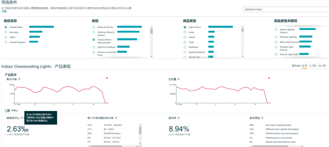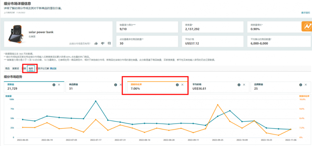 之前刚好有回复这个问题,要绝对精准的转化率没办法,几种亚马逊官方查看预估转化率的方法:在亚马逊后台,商机探测器里面搜索关键词,即可找到对应的细分市场,并查看对应关键词下的趋势发展图,找到搜索转化率就是了。(来源:亚马逊后台)