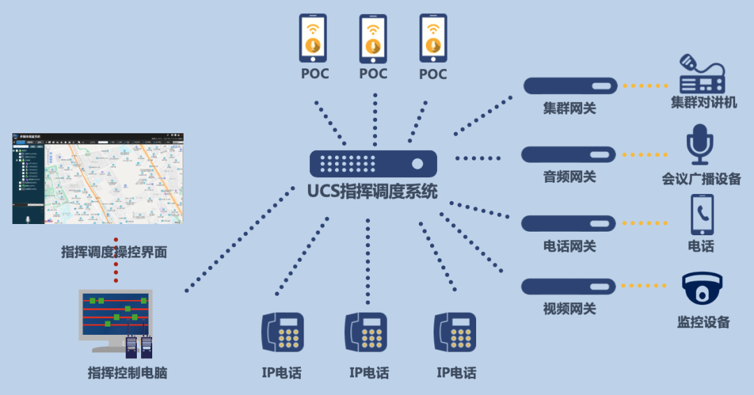 多媒体调度系统时整个系统的核心,一般通过部署服务器的方式,提供包括融合通信,多媒体调度的支撑能力,多媒体调度系统需要具备语音调度,视频调度,GIS调度,指令调度,预案管理等多种应用方式。当然这些都是调度系统等基础,在一些应用场景下我们需要多媒体调度系统具有POC公网对讲能力。可以实现视频回传,视频直播,人员定位等多种基于移动应用等场景。并且要对通话,对讲机等操作进行录音录像功能,对所有调度记录做到有据可查,直观便捷。