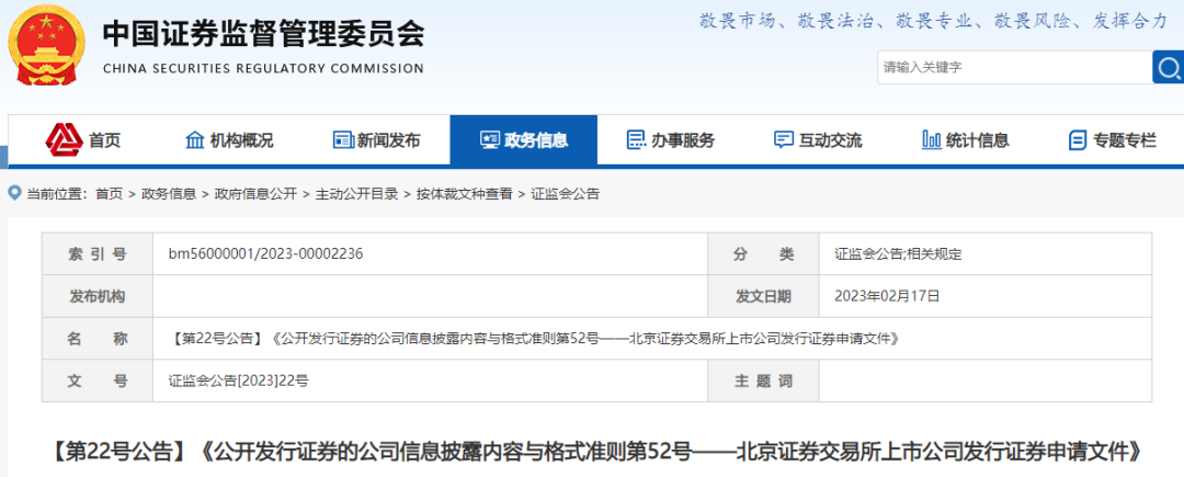 (证监会公告〔2023〕22号 2023年2月17日)(现公布《公开发行证券的公司信息披露内容与格式准则第52号-北京证券交易所上市公司发行证券申请文件》,自公布之日起施行。中国证监会 2023年2月17日)第二条 北交所上市公司(以下简称上市公司)进行证券发行,应当按本准则要求制作和报送申请文件。需要报送电子文件的,电子文件应当和预留原件一致。上市公司律师应当对报送的电子文件与原件的一致性出具鉴证意见。第三条 本准则规定的申请文件目录(见附件)是证券发行申请文件的最低要求。根据审核需要,中国证券监督管理委员会(以下简称中国证监会)和北交所可以要求上市公司和相关证券服务机构补充文件。上市公司认为某些文件对其不适用的,应当作出书面说明。第四条 上市公司发行证券募集说明书自最后签署之日起六个月内有效。募集说明书引用的财务报告在其最近一期截止日后六个月内有效,特殊情况下上市公司可以申请适当延长,但最多不超过一个月。第五条 申请文件一经受理,未经同意,不得增加、撤回或者更换。第六条 对于申请文件的原始纸质文件,上市公司不能提供有关文件原件的,应当由上市公司律师提供鉴证意见,或由出文单位盖章,以保证与原件一致。如原出文单位不再存续,由承继其职权的单位或作出撤销决定的单位出文证明文件的真实性。第七条 申请文件所有需要签名处,应当载明签名字样的印刷体,并由签名人亲笔签名,不得以名章、签名章等代替。申请文件中需要由上市公司律师鉴证的文件,上市公司律师应当在该文件首页注明“以下第XXX页至第XXX页与原件一致”,并签名和签署鉴证日期,律师事务所应当在该文件首页加盖公章,并在第×××页至第×××页侧面以公章加盖骑缝章。第八条 上市公司应当根据北交所对发行申请文件的审核问询以及中国证监会对申请文件的注册反馈问题,提供补充材料。保荐人和相关证券服务机构应当对相关问题进行尽职调查并补充出具专业意见。第九条 申请文件的扉页应当标明上市公司信息披露事务负责人、保荐人及相关证券服务机构项目负责人的姓名、电话、传真及其他方便的联系方式。第十条 未按本准则的要求制作和报送申请文件的,北交所按照有关规定不予受理。第十一条 上市公司发行证券依法未聘请保荐人的,无需提供保荐人出具的保荐文件。第十二条 本准则自公布之日起施行。《公开发行证券的公司信息披露内容与格式准则第52号-北京证券交易所上市公司发行证券申请文件》(证监会公告〔2021〕32号)同时废止。1. 北交所上市公司向不特定合格投资者公开发行股票申请文件3. 北交所上市公司向特定对象发行可转换公司债券申请文件1-1 上市公司向不特定合格投资者公开发行股票募集说明书2-1 上市公司关于本次向不特定合格投资者公开发行股票的申请报告2-2 上市公司董事会有关本次向不特定合格投资者公开发行股票的决议2-3 上市公司股东大会有关本次向不特定合格投资者公开发行股票的决议2-4 上市公司监事会对募集说明书真实性、准确性、完整性的审核意见4-1 最近三年的财务报告和审计报告及最近一期的财务报告4-3 会计师事务所关于上市公司的内部控制鉴证报告4-4 会计师事务所关于前次募集资金使用情况的报告(如有)4-5 经注册会计师核验的上市公司非经常性损益明细表5-3 上市公司律师关于上市公司董事、监事、高级管理人员、上市公司控股股东和实际控制人在相关文件上签名盖章的真实性的鉴证意见6-1 有关部门募集资金投资项目的审批、核准或备案文件(如有)6-2 上市公司拟收购资产(包括权益)的有关财务报告、审计报告、资产评估报告(如有)6-3 上市公司拟收购资产(包括权益)的合同或其草案(如有)7-2 上市公司关于本次发行是否涉及重大资产重组的说明7-3 上市公司全体董事、监事、高级管理人员对发行申请文件真实性、准确性和完整性的承诺书以及前述主体、上市公司和控股股东、实际控制人及与本次股票公开发行相关的保荐人、证券服务机构及相关责任人员关于不得影响或干扰发行上市审核注册工作的承诺书7-4 上市公司、保荐人关于申请电子文件与预留原件一致的承诺函2-1 上市公司关于本次向特定对象发行股票的申请报告2-2 上市公司董事会有关本次向特定对象发行股票的决议2-3 上市公司股东大会有关本次向特定对象发行股票的决议2-4 上市公司监事会对募集说明书真实性、准确性、完整性的审核意见4-1 最近二年的财务报告和审计报告及最近一期(如有)的财务报告4-3 会计师事务所关于上市公司的内部控制鉴证报告4-4 经注册会计师核验的上市公司非经常性损益明细表4-5 上市公司董事会、会计师事务所及注册会计师关于最近一年保留意见审计报告的补充意见(如有)5-3 关于上市公司董事、监事、高级管理人员以及上市公司控股股东、实际控制人在相关文件上签名盖章的真实性的鉴证意见6-1 有关部门对募集资金投资项目的审批、核准或备案文件(如有)6-2 本次向特定对象发行收购资产相关的最近一年及一期(如有)的财务报告及其审计报告、资产评估报告(如有)6-3 上市公司拟收购资产或股权的合同或其草案(如有)7-1 国务院主管部门关于引入境外战略投资者的有关文件(如有)7-3 上市公司关于本次发行是否涉及重大资产重组的