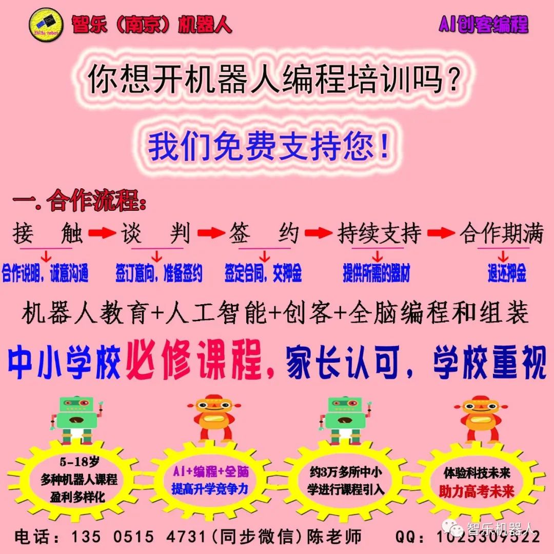 智乐机器人原名智乐(南京)机器人培训有限公司,致力于3-16岁幼少儿机器人的研发、教育、生产和销售为一体的公司。通过对机器人的研发、设计、组装、编程与运行等,激发学生学习兴趣、培养学生动手能力、创造力和思维能力等等;让孩子在动手操作的过程中得到知识和能力的培养。中心课程主要分为积木类、电动类、单片机机器人类、人形机器人类等,分别针对幼儿、小学及初中以上的孩子等。在幼儿阶段所涉及的是积木模块类,小学以上则接触单片机和人形机器人等,而单片机则能很好的与国内外大型机器人比赛接轨,使孩子得到更大的发展。