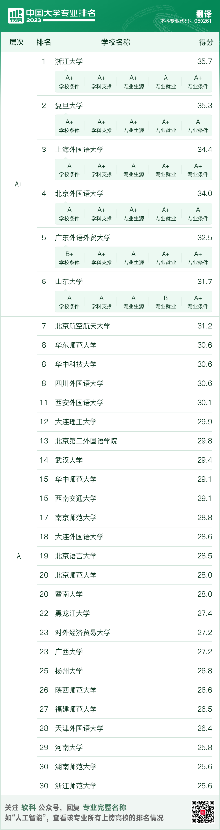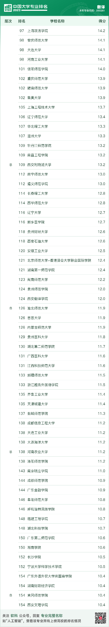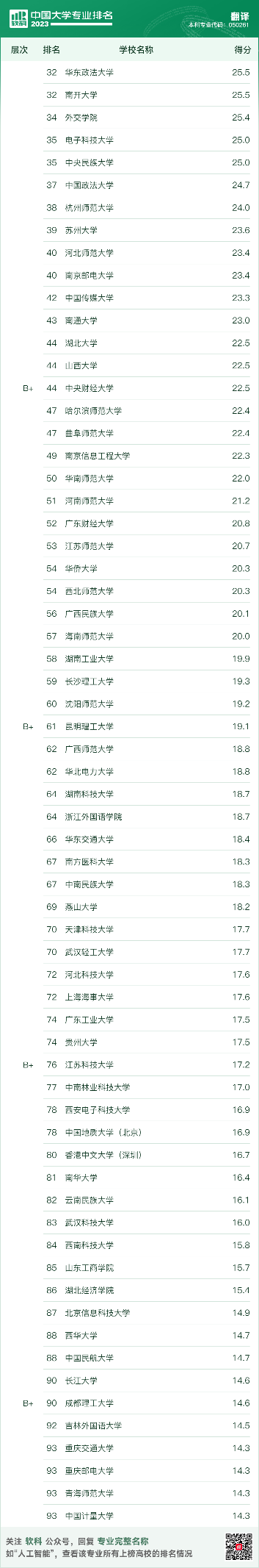 翻译专业排名结果如下: