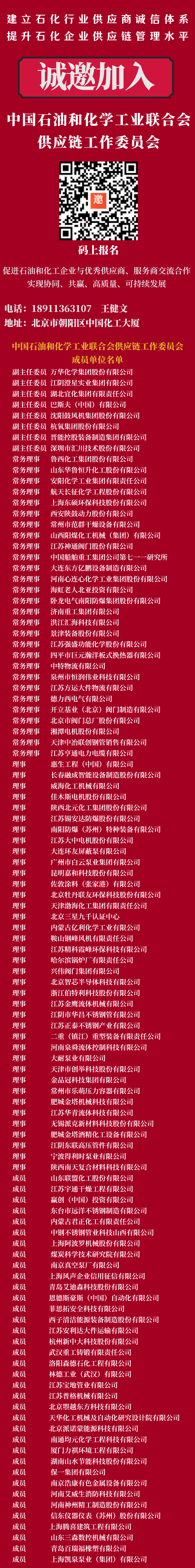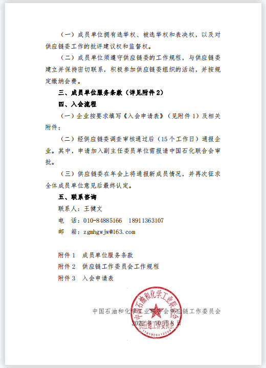 中国石油和化学工业联合会供应链工作委员会(以下简称供应链委)成立于2014年,是中国石油和化学工业联合会的重要分支机构,宗旨是建立石油和化工行业供应商诚信体系,提升石化企业供应链管理水平。多年来,供应链委在行业合格供应商筛选评价,供应链相关标准编制,行业供应链采购大会组织等促进采供双方交流合作方面,做了大量卓有成效的工作,得到石化及上下游企业的广泛认可和支持。为更好地履行委员会职责,促进石化行业供应链增强运行质量和可持续性,2023年,供应链委员会将进一步扩大成员单位范围,优化成员结构,加大对成员单位的服务力度,与成员单位共创共生共赢的新生态。现诚邀企事业单位加入供应链委,具体内容如下:(二)为石化行业配套的供应商、服务商、贸易商企业(行业合格供应商、可信服务商优先加入;尚未参评的供应商、服务商、贸易商需要经过信用筛选评价之后方可申请加入)。成员单位权利与义务(详见附件加微信18911363107获取)(一)成员单位拥有选举权、被选举权和表决权,以及对供应链委工作的批评建议权和监督权。(二)成员单位须遵守供应链委的工作规程,与供应链委建立并保持密切联系,积极参加供应链委组织的活动,并按规定缴纳会费。(一)企业按要求填写《入会申请表》及相关附件(加微信18911363107获取);(二)经供应链委调查审核通过后(15个工作日)通报企业。其中,申请加入副主任委员单位需报请中国石化联合会审批。(三)供应链委在年会上将通报新成员情况,并再次征求全体成员单位意见后最终认定。相关附件加联系人微信获取(18911363107)