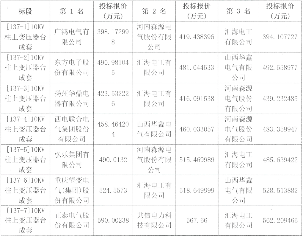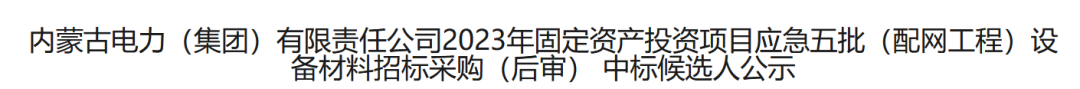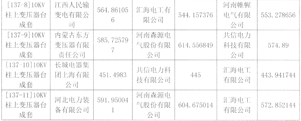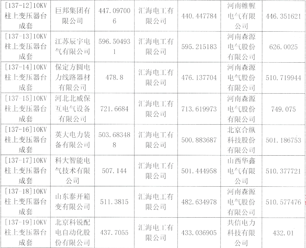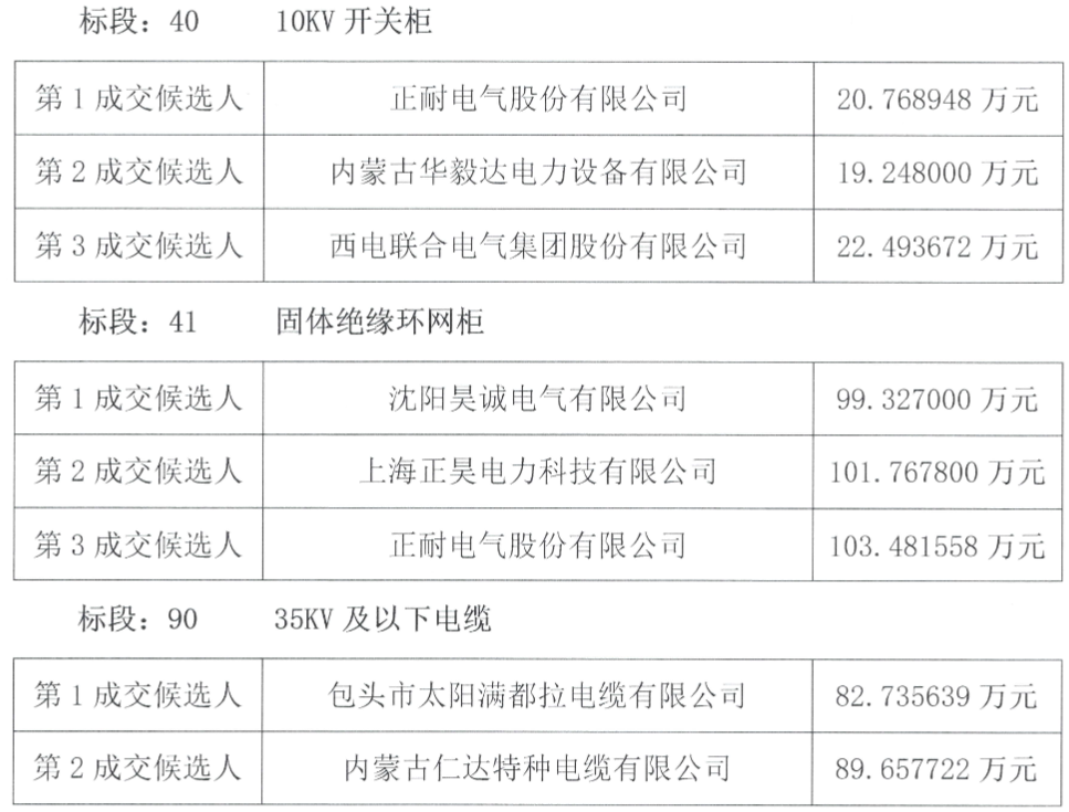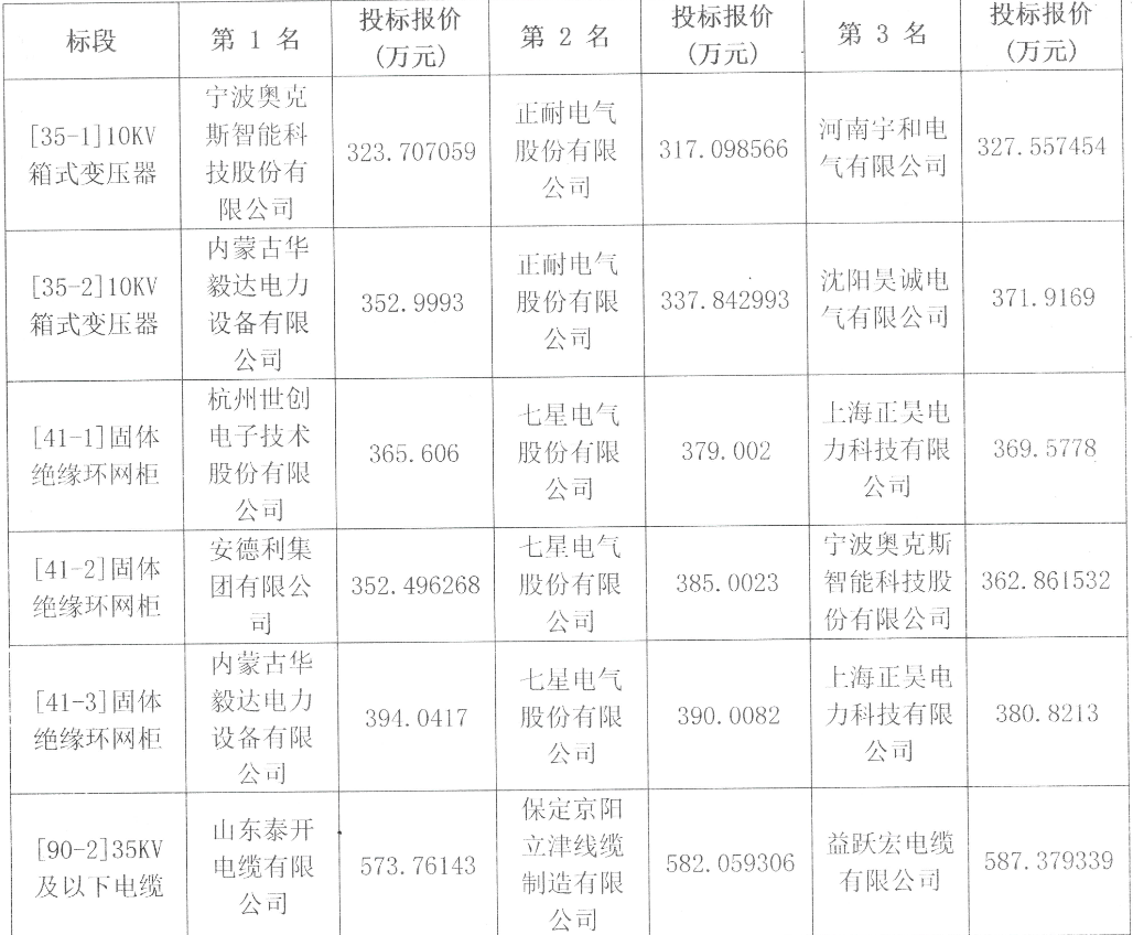 近日,内蒙古电力集团发布了2023年固定资产投资项目应急五批(配网工程)设备材料招标采购中标候选人名单公布。10KV柱上变压器台成套类,有广鸿电气有限公司、东方电子股份有限公司、扬州华鼎电器有限公司、河南森源电气股份有限公司、汇海电工有限公司、山东泰开箱变有限公司等数十家公司投标价格公示,其中最低报价为汇海电工有限公司给出的349.107727万元。10KV箱式变压器中标候选人有:宁波奥克斯智能科技股份有限公司、内蒙古华毅达电力设备有限公司、正耐电气股份有限公司、河南宇和电气有限公司、沈阳昊诚电气有限公司入选,其中最低报价为正耐电气股份有限公司,报价金额为317.098566万元。固体绝缘环网柜中标候选人有:杭州世创电子技术股份有限公司、七星电气股份有限公司、上海正昊电力科技有限公司、安德利集团有限公司、宁波奥克斯智能科技股份有限公司、内蒙古华毅达电力设备有限公司入选。其中最低报价为安德利集团有限公司,其报价为352.494268万元。