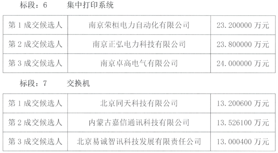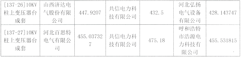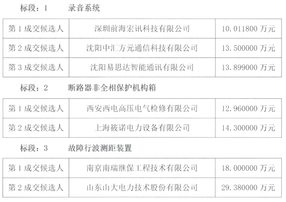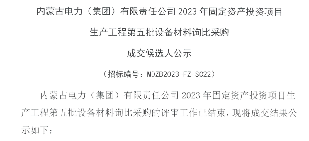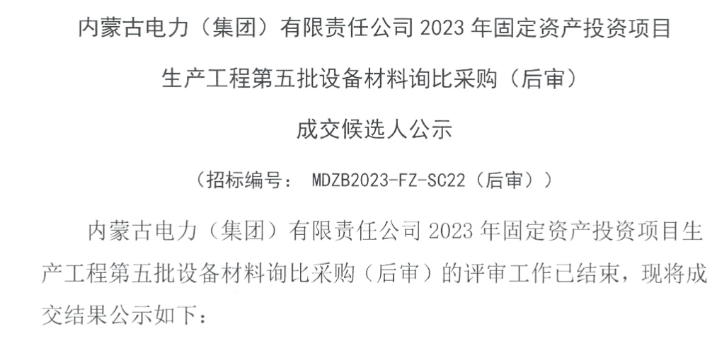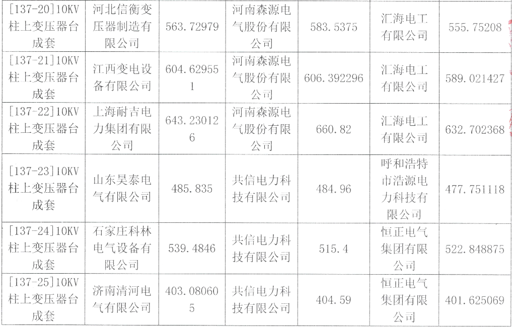 近日,内蒙古电力集团发布了2023年固定资产投资项目应急五批(配网工程)设备材料招标采购中标候选人名单公布。10KV柱上变压器台成套类,有广鸿电气有限公司、东方电子股份有限公司、扬州华鼎电器有限公司、河南森源电气股份有限公司、汇海电工有限公司、山东泰开箱变有限公司等数十家公司投标价格公示,其中最低报价为汇海电工有限公司给出的349.107727万元。10KV箱式变压器中标候选人有:宁波奥克斯智能科技股份有限公司、内蒙古华毅达电力设备有限公司、正耐电气股份有限公司、河南宇和电气有限公司、沈阳昊诚电气有限公司入选,其中最低报价为正耐电气股份有限公司,报价金额为317.098566万元。固体绝缘环网柜中标候选人有:杭州世创电子技术股份有限公司、七星电气股份有限公司、上海正昊电力科技有限公司、安德利集团有限公司、宁波奥克斯智能科技股份有限公司、内蒙古华毅达电力设备有限公司入选。其中最低报价为安德利集团有限公司,其报价为352.494268万元。