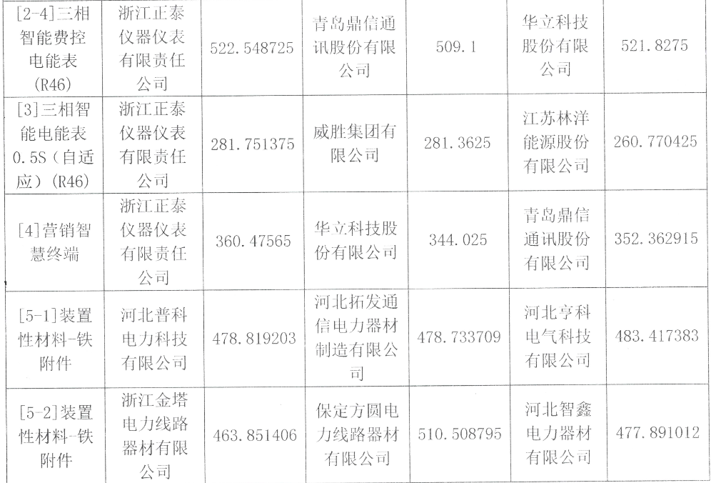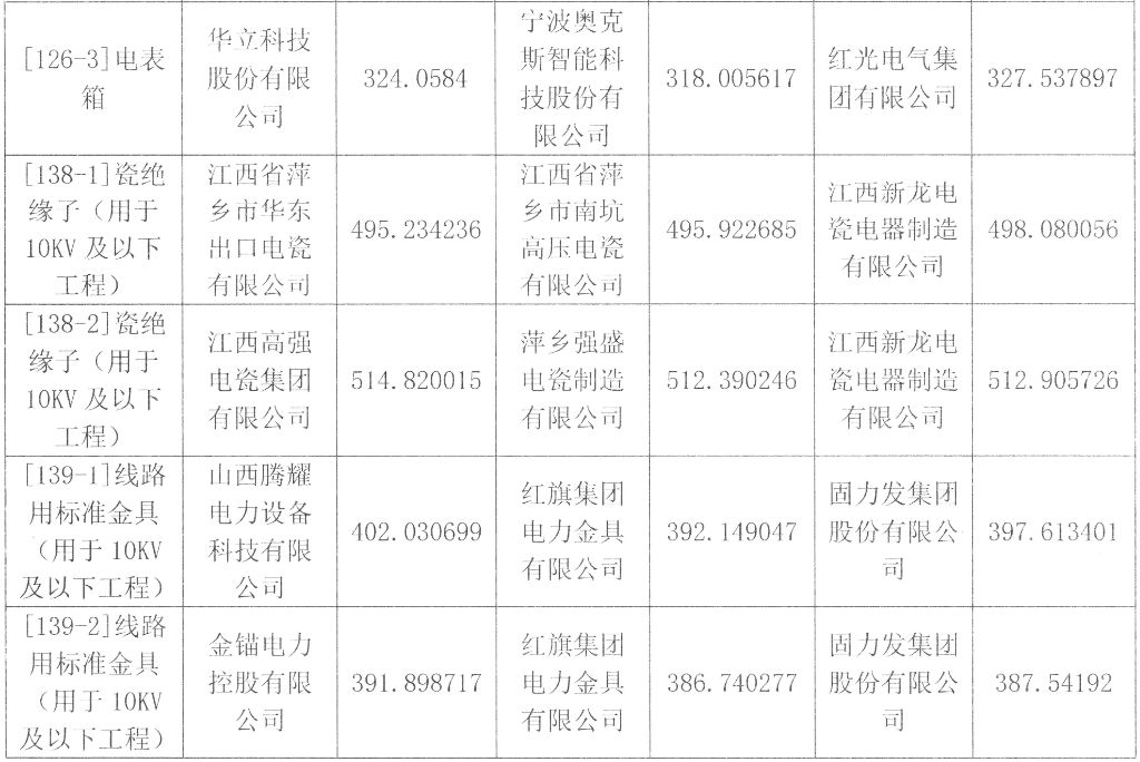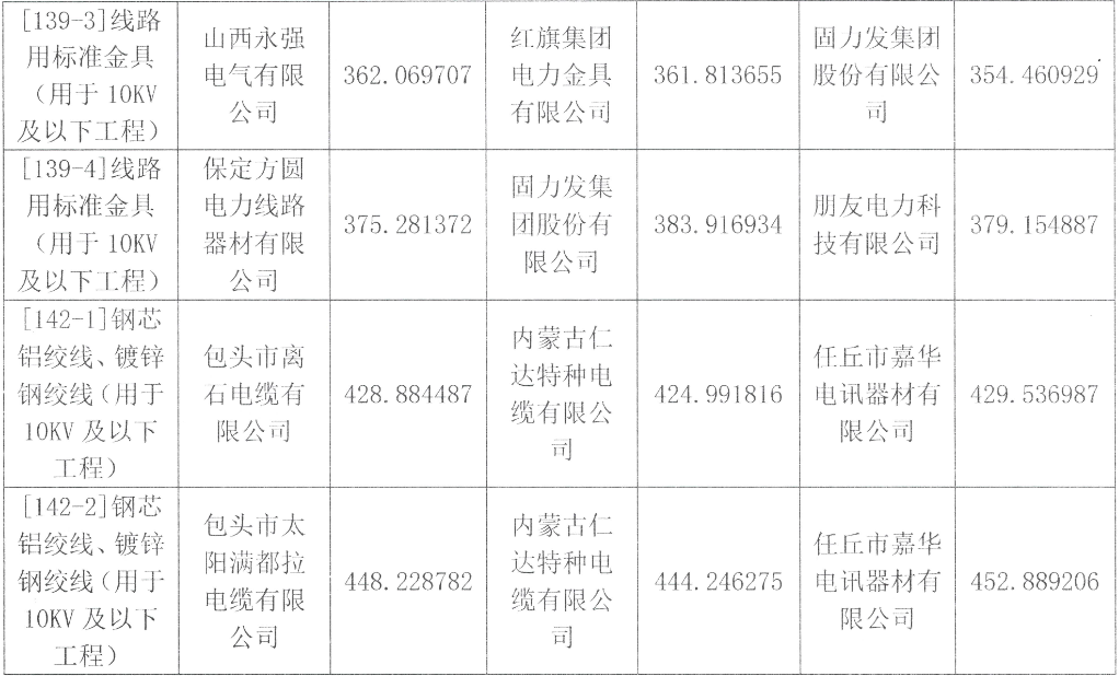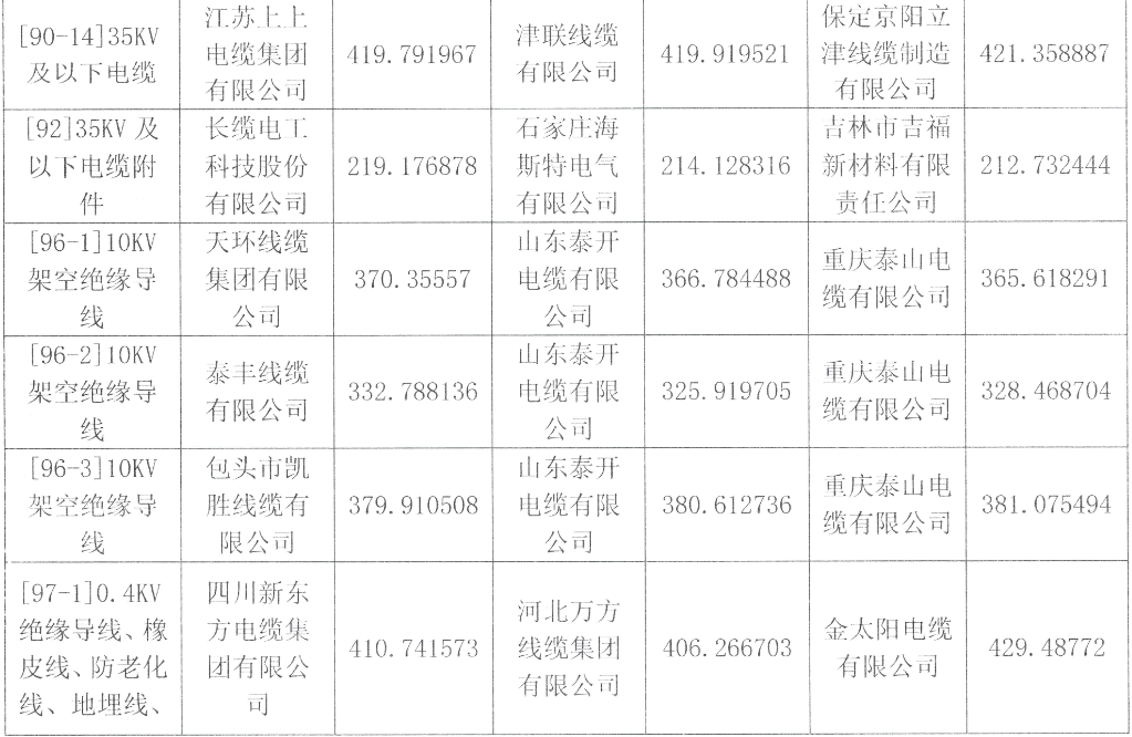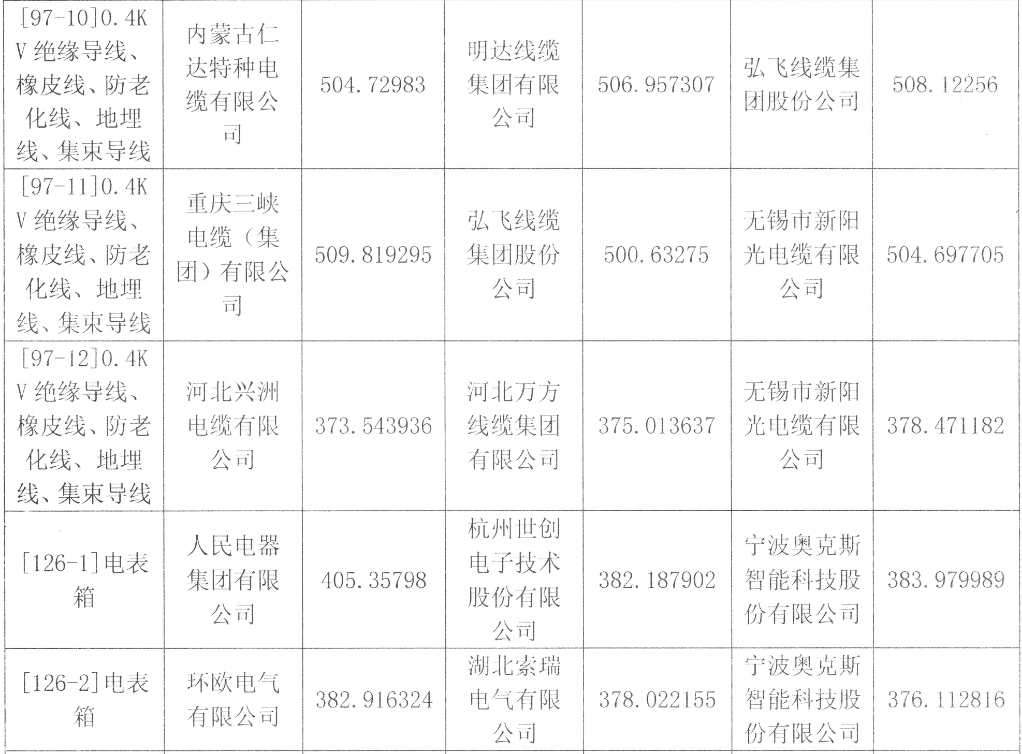 35KV及以下电缆中标公示名单企业数量比较多,建业电缆集团有限公司、保定京阳立津线缆制造有限公司、益跃宏电缆有限公司、江苏亨通高压海缆有限公司、京缆电缆有限公司、西隆电缆有限公司、无锡江南电缆有限公司、天环线缆集团有限公司、重庆泰山电缆有限公司、重庆三峡电缆(集团)有限公司等数十家企业入围。其中最低报价为西隆电缆有限公司,其报价为369.912407万元。35KV及以下电缆附件中标公示名单只有三家公司,分别是:长缆电工科技股份有限公司、石家庄海斯特电气有限公司、吉林市吉福新材料有限责任公司,其最低报价为吉林市吉福新材料有限责任公司212.732444万元。10KV架空绝缘导线中标公示名单中有:天环线缆集团有限公司、山东泰开电缆有限公司、重庆泰山电缆有限公司、包头市凯胜线缆有限公司,其中最低报价为,山东泰开电缆有限公司给出的325.919705万元。0.4KV绝缘导线、橡皮线、防老化线、地埋线集束导线中标名单中有:四川新东方电缆集团有限公司、河北万方线缆集团有限公司、金太阳电缆有限公司、包头市凯胜线缆有限公司、弘飞线缆集团有限公司、包头市太阳满都拉电缆有限公司 、明达线缆集团有限公司、无锡曙光电缆有限公司等十几家公司入选。报价最低的是河北万方线缆集团有限公司的252.679681万元。电表箱中标公示名单中,有人民电器集团有限公司、杭州世创电子技术股份有限公司、宁波奥克斯智能科技股份有限公司、环欧电器有限公司、湖北索瑞电器有限公司、华立科技股份有限公司、红光电气集团有限公司入围,其中最低报价为宁波奥克斯智能科技股份有限公司报出的318.005617万元。瓷绝缘子中标公示名单中包括:江西省萍乡市华东出口电瓷有限公司、江西省萍乡市南坑高压电瓷有限公司、江西新龙电瓷电器制造有限公司,其中报价最低的是江西省萍乡市华东出口电瓷有限公司给出的495.234236万元。线路用标准金具入围的企业有:山西腾耀电力设备科技有限公司、红旗集团电力金具有限公司、固力发集团股份有限公司、金锚电力控股有限公司、红旗集团电力金具有限公司、山西永强电气股份有限公司、红旗集团电力金具有限公司、保定方圆电力线路器材有限公司、朋友电力科技有限公司。其中报价最低的是354.460929万元。钢芯铝绞线、镀锌钢绞线入围企业有:包头市离石电缆有限公司、内蒙古仁达特种电缆有限公司、任丘市嘉华电讯器材有限公司、包头市太阳满都拉电缆有限公司,其中报价最低的是内蒙古仁达特种电缆有限公司给出的424.991816万元。单相智能费控电能表仅有三家公司入围,这三家公司分别是:浙江正泰仪器仪表有限责任公司、威胜集团有限公司、华立科技股份有限公司。其中最低报价是威胜集团有限公司、华立科技股份有限公司,这两家公司给出的报价同为266.049万元。--END--