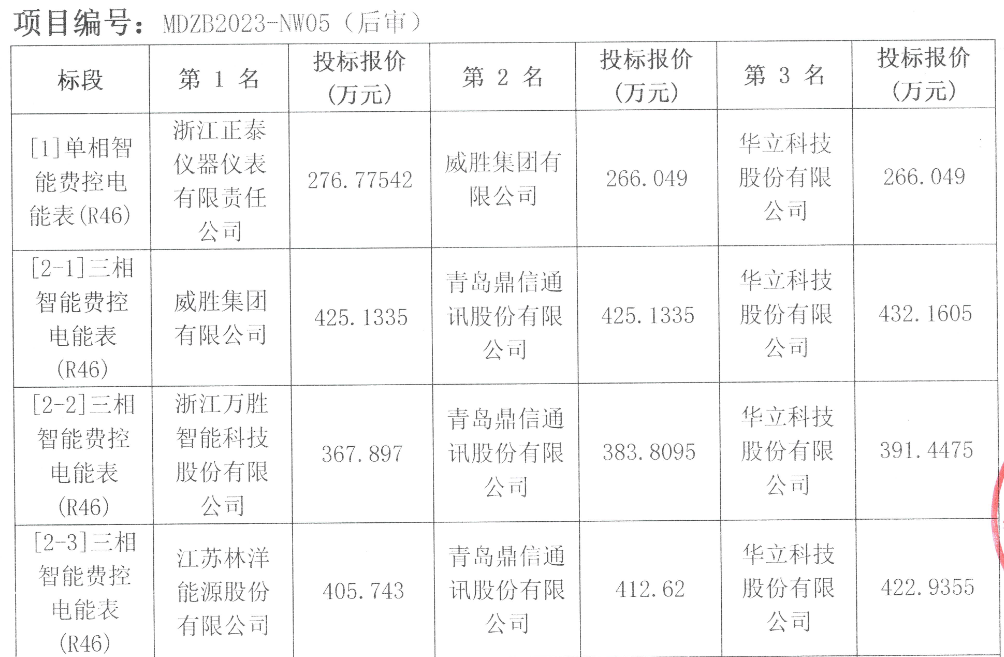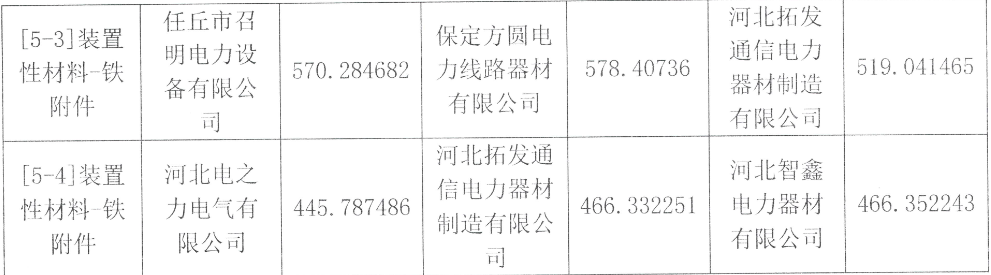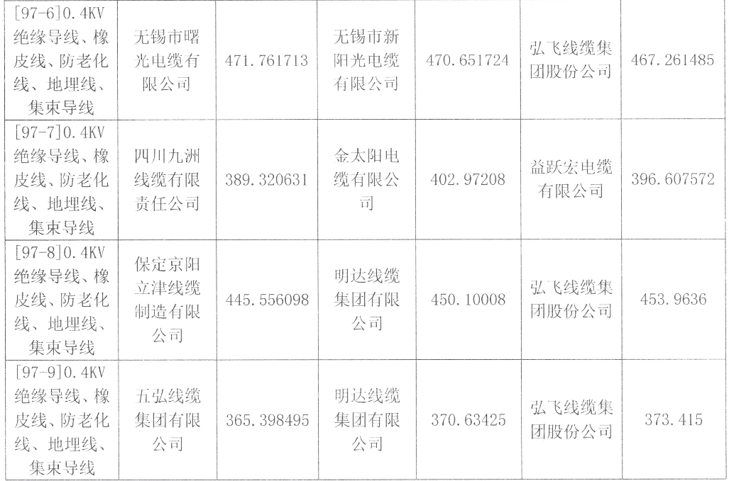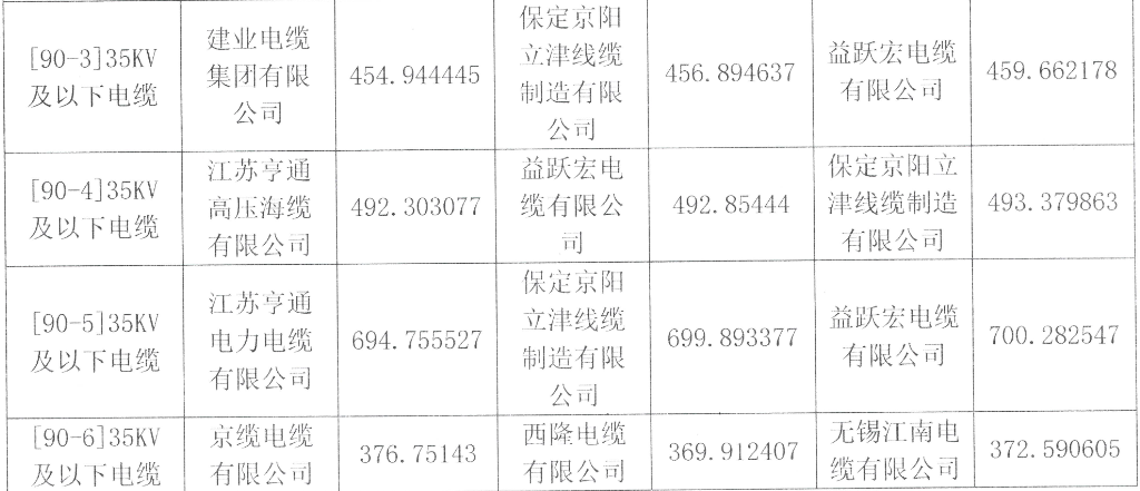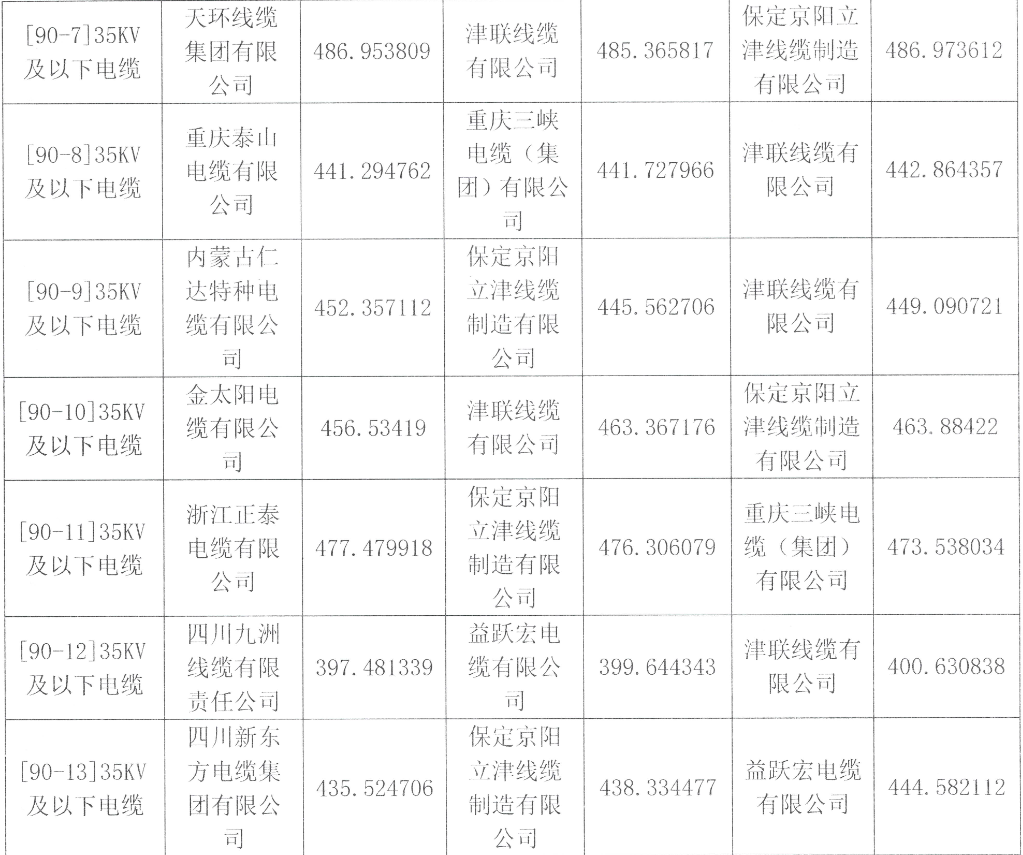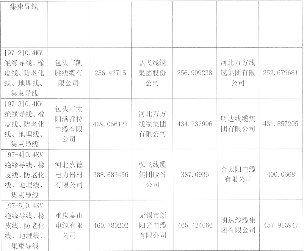 35KV及以下电缆中标公示名单企业数量比较多,建业电缆集团有限公司、保定京阳立津线缆制造有限公司、益跃宏电缆有限公司、江苏亨通高压海缆有限公司、京缆电缆有限公司、西隆电缆有限公司、无锡江南电缆有限公司、天环线缆集团有限公司、重庆泰山电缆有限公司、重庆三峡电缆(集团)有限公司等数十家企业入围。其中最低报价为西隆电缆有限公司,其报价为369.912407万元。35KV及以下电缆附件中标公示名单只有三家公司,分别是:长缆电工科技股份有限公司、石家庄海斯特电气有限公司、吉林市吉福新材料有限责任公司,其最低报价为吉林市吉福新材料有限责任公司212.732444万元。10KV架空绝缘导线中标公示名单中有:天环线缆集团有限公司、山东泰开电缆有限公司、重庆泰山电缆有限公司、包头市凯胜线缆有限公司,其中最低报价为,山东泰开电缆有限公司给出的325.919705万元。0.4KV绝缘导线、橡皮线、防老化线、地埋线集束导线中标名单中有:四川新东方电缆集团有限公司、河北万方线缆集团有限公司、金太阳电缆有限公司、包头市凯胜线缆有限公司、弘飞线缆集团有限公司、包头市太阳满都拉电缆有限公司 、明达线缆集团有限公司、无锡曙光电缆有限公司等十几家公司入选。报价最低的是河北万方线缆集团有限公司的252.679681万元。电表箱中标公示名单中,有人民电器集团有限公司、杭州世创电子技术股份有限公司、宁波奥克斯智能科技股份有限公司、环欧电器有限公司、湖北索瑞电器有限公司、华立科技股份有限公司、红光电气集团有限公司入围,其中最低报价为宁波奥克斯智能科技股份有限公司报出的318.005617万元。瓷绝缘子中标公示名单中包括:江西省萍乡市华东出口电瓷有限公司、江西省萍乡市南坑高压电瓷有限公司、江西新龙电瓷电器制造有限公司,其中报价最低的是江西省萍乡市华东出口电瓷有限公司给出的495.234236万元。线路用标准金具入围的企业有:山西腾耀电力设备科技有限公司、红旗集团电力金具有限公司、固力发集团股份有限公司、金锚电力控股有限公司、红旗集团电力金具有限公司、山西永强电气股份有限公司、红旗集团电力金具有限公司、保定方圆电力线路器材有限公司、朋友电力科技有限公司。其中报价最低的是354.460929万元。钢芯铝绞线、镀锌钢绞线入围企业有:包头市离石电缆有限公司、内蒙古仁达特种电缆有限公司、任丘市嘉华电讯器材有限公司、包头市太阳满都拉电缆有限公司,其中报价最低的是内蒙古仁达特种电缆有限公司给出的424.991816万元。单相智能费控电能表仅有三家公司入围,这三家公司分别是:浙江正泰仪器仪表有限责任公司、威胜集团有限公司、华立科技股份有限公司。其中最低报价是威胜集团有限公司、华立科技股份有限公司,这两家公司给出的报价同为266.049万元。--END--