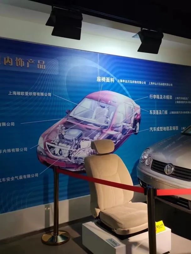 最后实践团进入三楼的专题馆,在这里博物馆展示了目前纺织产业所用的各类天然纤维与化学纤维,各式各样的功能型面料,以及它们如何被应用在航空航天,汽车产业,工业上的各种场景。