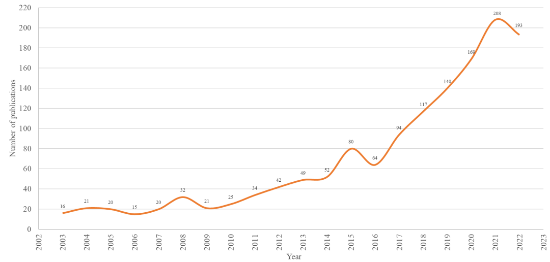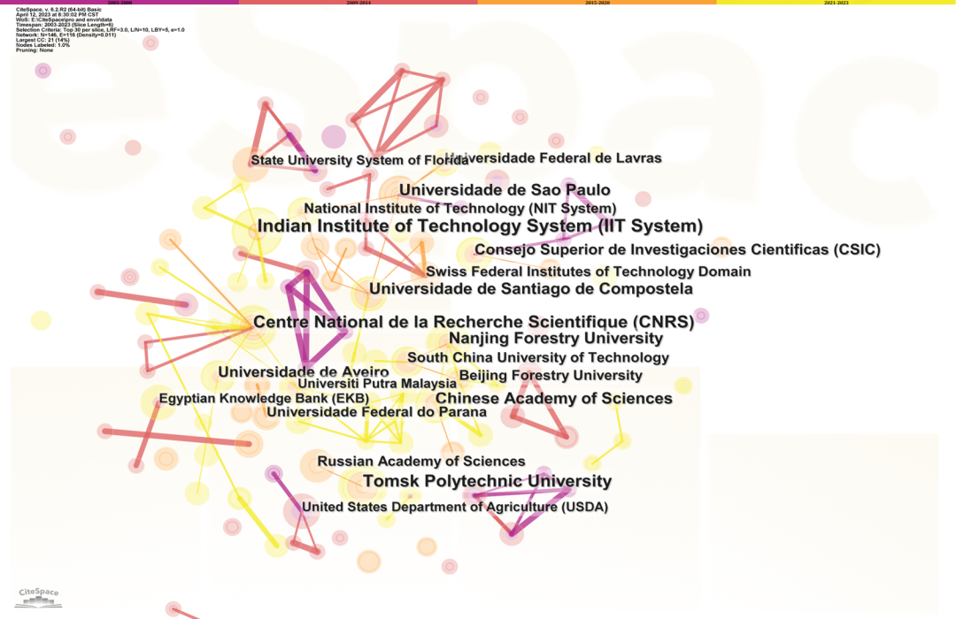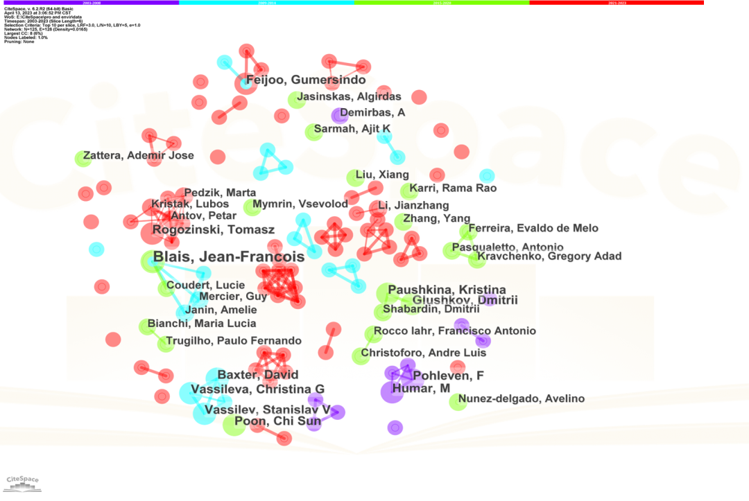 从2003到2023年,作者合作网络中共包含125位作者、128个合作关系,如图5所示,作者之间的合作主要集中在同一机构或同一课题组。如圣地亚哥联合大学的Gumersindo Feijoo团队,浙江理工大学的张勇团队,四川大学王琪院士团队,卢布尔雅那大学的Miha Humar团队等。