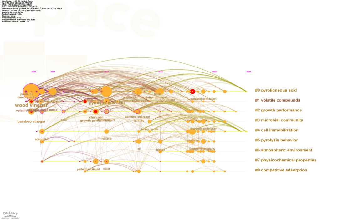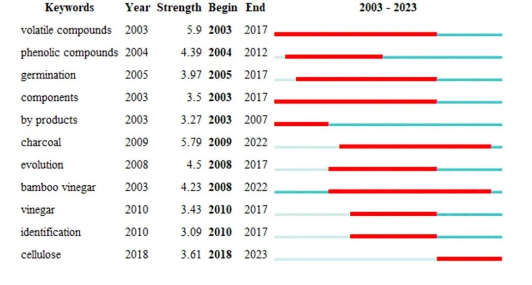 从2003到2023年,如图7所示,关键词时间线图共包含308个关键词、1268条连线。主要与木醋液、挥发性物质、生长性能、微生物群落等关键词有关。其中对木醋液的研究可以追溯到2003年,最早的研究涉及木醋液化合物组分和木醋对发芽率的影响等。而在挥发性物质一行,抗氧化物的研究催生了抗氧化活性、生物质、抗真菌活性等研究。在生长性能一行,最早的研究为2003年的挥发性物质组分研究,其中酚类化合物的研究与抗氧化活性、抗真菌活性等研究密切相关。值得注意的是,炭的研究催生了醋、竹炭的研究,进而将关注点引向竹醋的研究,而竹醋的研究主要在生长性能上,具体为对微生物群落的影响。同时,在热解、大气环境、物化性质、吸附等领域关注更多的是重金属、吸附性能、生物油、去除率等关键词。从表3可以看出,2017年以前,关于组分的研究较多,而从2009年开始,炭、竹醋一直是该领域研究的热点,且2017年之后,纤维素的研究成为热门。