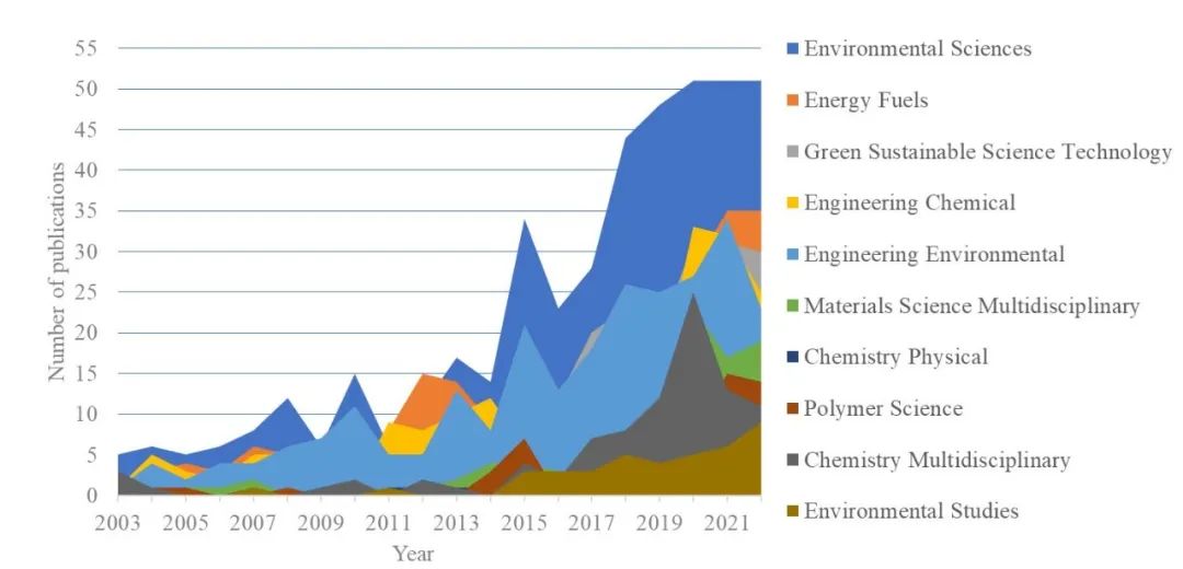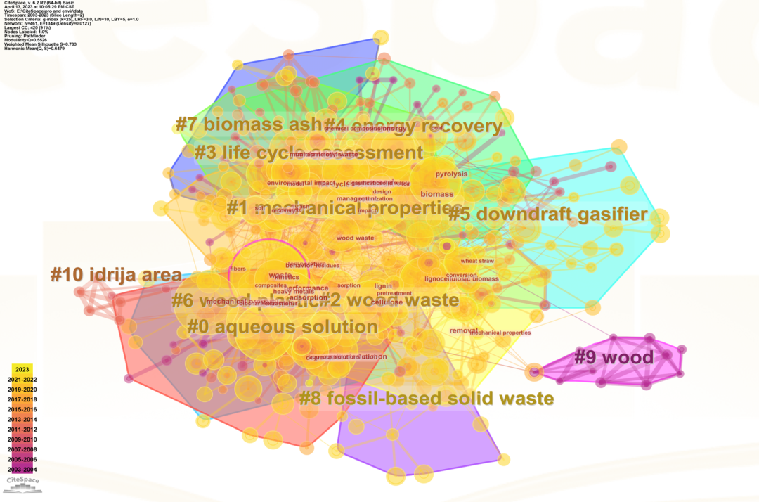 从2003到2023年,文献共被引网络中共包含461篇文献、1349个共被引关系,如图所示,最大的聚类为#0水溶液,其次依次(聚类由大到小)为力学性能、木材废弃物、生命周期评估、能源再生、下吸式气化炉、木塑、生物质灰、化石固体废物、木材、水域。除#9木材聚类外,其余各聚类之间有明显重叠,具有多学科交叉的特点。