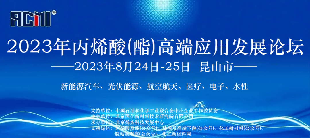 为了帮助企业提升竞争力,并为缓解行业供需矛盾找寻出路,加强丙烯酸(酯)高端下游应用技术开发及下游市场延伸拓展。北京国化新材料技术研究院有限公司拟定于2023年8月24-25日在江苏昆山市组织召开“2023年丙烯酸(酯)高端应用发展论坛”。本次论坛聚焦丙烯酸乳液及胶粘剂两大下游领域,预计将邀请逾20位行业专家,分享各自在新能源汽车、光伏能源、航空航天、医疗、电子等高端下游领域的研究和应用前沿资讯。具体如下: