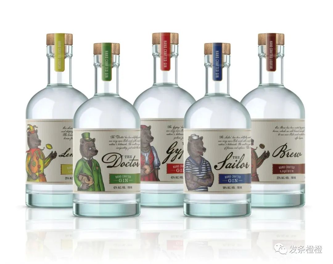 在上图的案例中,由Mila Katagarova为杜松子酒品牌Tiny Bear Distillery做的设计包装,就以小熊吉祥物为核心,让代表不同口味的杜松子酒的小熊都穿上与酒的口味特征相符的衣服。