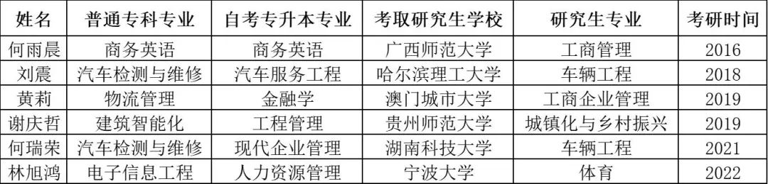 目前我校自考相沟通专升本与6所本科院校合作开设13个品牌本科专业,可与专科同专业或跨专业选择报读。有部分同学从我校自考相沟通本科毕业后参加了全国硕士研究生统一招生考试,考进心目中的理想大学,取得了研究生学历或硕士学位。以下是部分同学考取研究生相关信息: