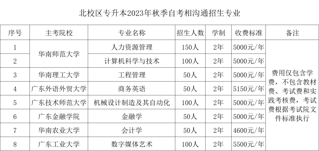 为满足我校学生提升学历的需求,增强就业竞争力,依据《关于开展广东省高等教育自学考试与高职高专教育相沟通试点工作有关问题的通知》(粤考委〔2006〕22号)文件精神,我校与华南师范大学、华南理工大学、华南农业大学、广东技术师范大学、广东外语外贸大学、广东金融学院、广东工业大学等本科院校联合开设自考专升本相沟通助学班;