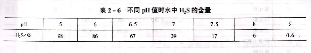 溶液中溶解状的H2S与硫化氢化合物总含量(H2S+HS-+S2-)之间的比例与水的pH值有关(表2-6)。