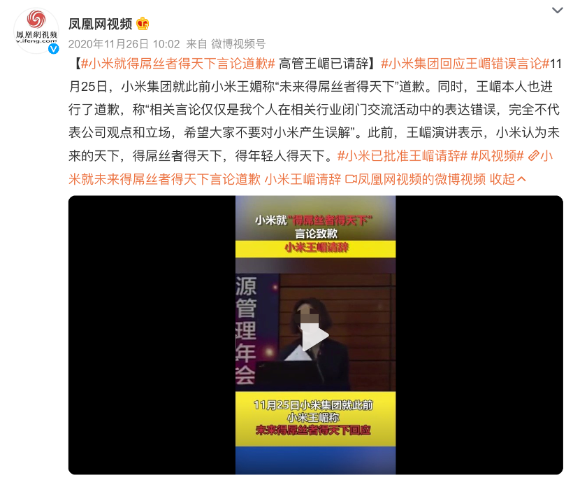 ▲ 图源:凤凰网视频官方微博shu f对,你小米当年是低价高配不错,是价格屠夫我们也很感激,甚至没有小米,就没有中国山寨机时代的终结。但是,我们感谢的是雷军口中“让每个人享受到科技的乐趣”,而不是王嵋嘴里“小米的用户都是屌丝”。其实说到底,所谓的“屌丝饮料”、“屌丝神机”都不重要,重要的是你自己如何过好自己的生活。别管什么三块是面子,四块是生活,顺从内心的合理选择那就没有错。谁不想天天花天酒地,吃上等牛排,喝陈酿红酒,享人生乐趣,但摸摸钱包,看看车贷房贷,还是选择下班回家痛饮一杯冰红茶、冰可乐。先别管什么糖分不糖分,至少那一刻的快乐是充分而真实的。