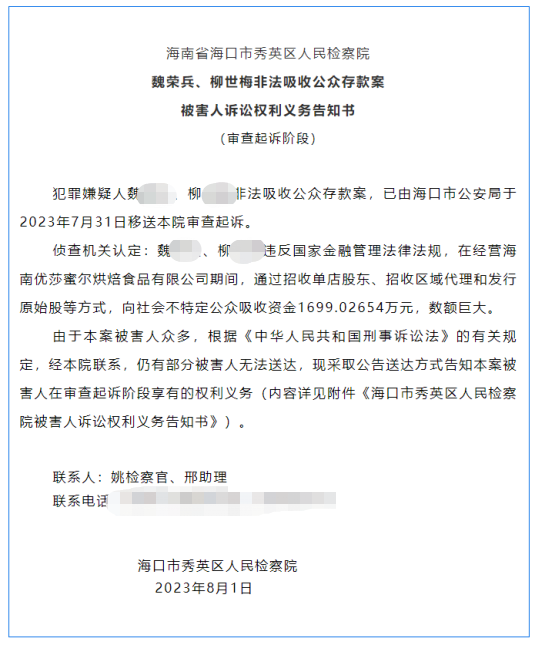 因涉嫌非法吸收公众存款超1699万元,海南一烘焙店两负责人被移送法院审查起诉。近日,海口市秀英区人民检察院微信公众号发布了《海南省海口市秀英区人民检察院魏某、柳某非法吸收公众存款案被害人诉讼权利义务告知书》。
