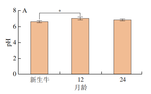 饲养月龄会对‘夏南’牛的肉品质、肌内脂肪含量以及长链脂肪酸的含量产生一定的影响,可以将饲养月龄作为评价牛肉品质的重要指标之一。不同饲养月龄‘夏南’牛肉的滴水损失率和剪切力没有显著差异,新生‘夏南’牛肉pH值偏低,其蒸煮损失率较12 月龄和24 月龄牛肉偏高,12 月龄和24 月龄‘夏南’牛肉之间的pH值、蒸煮损失率、滴水损失率、剪切力差异不大,因此12 月龄和24 月龄‘夏南’牛肉品质更好;随着饲养月龄的增长,‘夏南’牛肌内脂肪沉积量也逐渐增加并向周围组织扩散,但是TG含量变化不显著;12 月龄和24 月龄‘夏南’牛肉的含水量低于新生牛,肌内脂肪质量分数高于新生牛;12 月龄和24 月龄‘夏南’牛肉中的花生四烯酸的含量极显著高于新生牛,24 月龄‘夏南’牛肉中亚油酸和总PUFA的含量显著高于其他两个月龄组,其中24 月龄‘夏南’牛肉中亚油酸在PUFA中相对含量最高。综合各项指标,3 个饲养月龄组中,24 月龄的‘夏南’牛肉品质性状更好,并且脂肪酸的含量更能符合人们的健康标准。