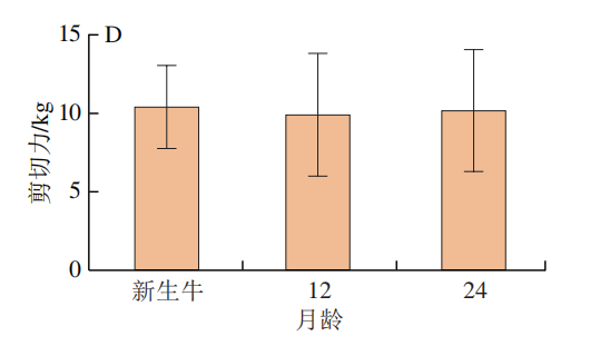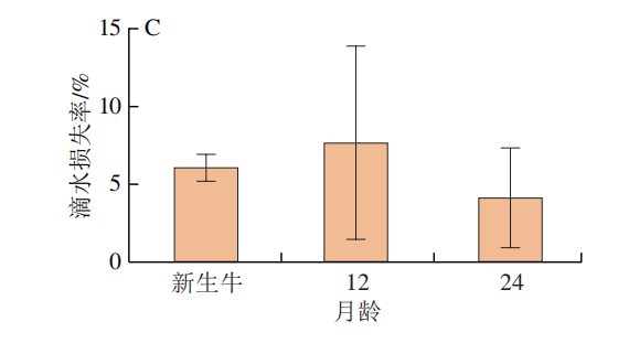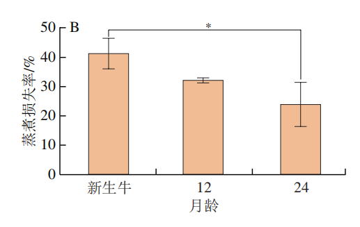 由图1可知,‘夏南’牛背肌的pH值随月龄的增长呈现先显著上升(P<0.05)后下降(P>0.05)的趋势;‘夏南’牛背肌的蒸煮损失率随月龄的增长呈逐渐下降的趋势,其中新生‘夏南’牛背肌蒸煮损失率显著高于24 月龄(P<0.05);不同月龄组的滴水损失率和剪切力均无显著差异(P>0.05)。有研究表明,肌肉的剪切力与肌内脂肪、甘油三酯含量呈负相关。剪切力越小,肌肉越鲜嫩,随着月龄的不断增长,动物肌肉中的结缔组织含量逐渐下降,同时结缔组织的交联程度逐渐上升,肌肉中的胶原蛋白含量减少,从而导致肌肉老化。本研究结果表明,新生‘夏南’牛肉的蒸煮损失率在3 月龄中最高,另外两个高月龄组的蒸煮损失率较低,这与‘早胜’公牛相似。