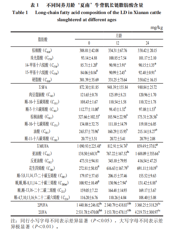 5.不同饲养月龄‘夏南’牛背肌长链脂肪酸含量