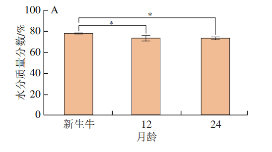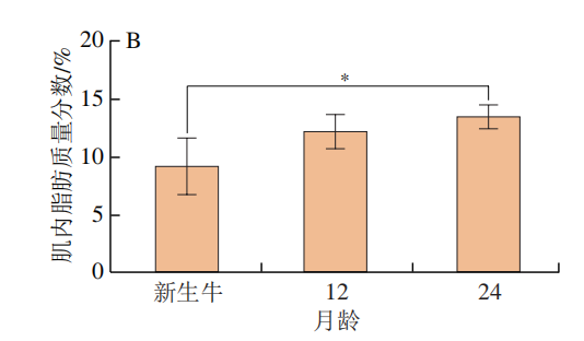 由图4可知,新生‘夏南’牛背肌水分质量分数显著高于12 月龄和24 月龄‘夏南’牛背肌(P<0.05),12 月龄与24 月龄‘夏南’牛背肌水分质量分数相比无显著差异(P>0.05);24 月龄‘夏南’牛背肌肌内脂肪质量分数显著高于新生‘夏南’牛(P<0.05),但12 月龄牛与新生牛背肌相比、24 月龄牛与12 月龄牛背肌相比,其肌内脂肪质量分数有逐渐上升趋势,但变化不显著(P>0.05)。