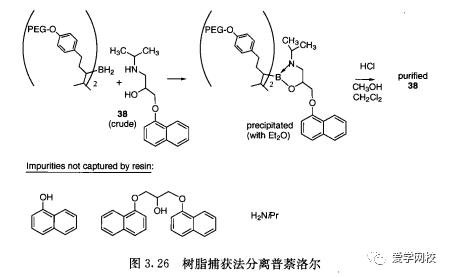 微胶囊化的Se(OTf);还被发现用于Mannich反应、Michael 加成和类傅-克酰基化反应[51],在未来,放大反应上化合物可能通过选择性吸附在树脂(树脂捕获)来回收。在这种情况下,产品以“捞出”的方式从一堆化合物的混合物中(即使在其中浓度较低)分离出来。生化生产中的一个类似分离方法是亲和层析。例如,通过把含生物素的混合物吸附到抗生物素蛋白.上来分离生物素。在最近的一个例子中,普萘洛尔38就是通过与聚合的二烷基硼烷结合而从反应混合物中分离出来(图3. 26)[52]。如果树脂捕获法用在放大反应上,出于成本考虑可能将仅限于高附加值化合物的分离。