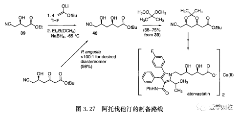 酶被用于商业用途已经有很长时间了,近年来使用酶制备光学活性材料再次活跃起来。这是由于人们对制备手性药物的兴趣逐渐增加C53 (见第16章)。而制药公司是酶促反应增长迅速的最大来源[54]。生物催化通常用来制备有两个或多个手性中心的分子或制备从简单的前体不容易选择性地进行化学转换的中间体[6]。只有一个手性中心的分子,一般从经 典的化学拆分来制备,或通过手性试剂的手性转移到非手性的原料上。最初生产阿托伐他汀的工艺是由39通过经典方法转换为手性二醇40 (图3.27),后来又有了生物催化制备40的工艺[56]。现在生物催化工艺可能是制备40的优选路线[55]。