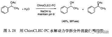 使用酶的好处是,许多酶催化反应可以在水里、室温下、很少或没有保护基团的情况下进行。酶的应用障碍主要是低反应稳定性、高成本、有时较差的立体选择性[5],以及相对很低的浓度条件。酶的反应也可以在有机溶剂中运行[58]。许多在放大反应上使用酶的问题都已被解决。酶的稳定性可以通过固定在坚实的支持物上,如玻璃珠、琼脂糖或硅胶上来得到增强59.60,固定化的最佳条件对维持酶催化剂的活性至关重要[01],固定化的试剂可以回收和循环利用,从而降低酶催化的整体成本。进行理想反应的参数需要彻底研究[62]。酶的成本也可以通过筛选和克隆增加酶产量来降低。交联酶晶体(CLEC81) 的催化活性比自然酶有很大的提高。它们的实际应用最近已通过水解动力学拆分苯乙醇醋酸酯(图3. 28)得到证实[6]。该催化剂可以在100L的规模上回收及循环利用8次。酶在将来反应中的用途会越来越多。