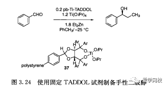 Seebach研究小组研究了用聚合物固定的手性TI-TADDOL催化剂来制备手性二级醇的反应(图3.24)。聚合物固定的催化剂37装在有网孔的“茶袋”里,只要不停地加入新鲜试剂和溶剂就可以简单地重复使用。该系统循环利用性结果表明当催化剂经过20个连续运行后,产品选择性从96%(S)仅下降至92%(S),平均收益率为90%[50]微胶囊化的Sc(OTf)s在循环流程的反应上显示出相当大的优势,发现这种试剂比单体路易斯酸的反应性更高。图3.25显示了一个TMS烯醇中间体的Michael反应的例子。