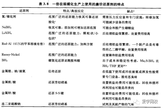 还原反应在放大反应上往往有许多顾虑,困难主要是因为还原反应过程中氢气的使用或氢气的产生的都需要为安全生产做额外的考虑并且对设备提出一定要求。在一个反应结束后,如何安全淬灭任何残余还原剂在放大反应上都是必须考虑的问题。还原反应的后处理可能会很繁琐,尤其是如果形成胶体盐。处置金属盐副产品可能是昂贵的,并且会引起严重的环境问题。要研发一套可以规模化生产的可靠的还原工艺需要相当注重细节。尽管还原反应有这些潜在的缺点,但一旦工艺已经研制成功并有适当的设备,还原反应也可以非常可靠的放大生产。表3.8列出了一些可靠的、已在规模化生产上使用的廉价还原剂,同时也显示了这些试剂的优点和缺点。