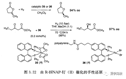BINAP是一个对许多反应特别是手性还原起到关键作用的配体。一个例子是使用BINAP-Ru(OAc)2催化剂35制备手性内酯(图3. 22)[46]。使用聚合物束缚的手性BI-NAP-Ru催化剂,使得氢化产物的手性纯度高达99%ee[47]。不溶性的催化剂可以重复使用。对产品的分析表明,只有1%的催化剂残留,这可以简化产品的提纯。类似36的聚合物试剂的重复使用应该减少相对昂贵BINAP配体的总成本。
