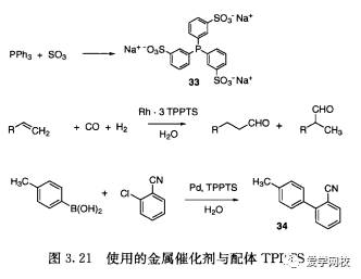设计合适的配体是最近金属催化剂成功的关键。工业界研究和开发了当产物不溶于水的情况下可回收再利用的水溶性的催化剂。例如使用由磺化三苯基制备的TPPTS33(图3.21)。TPPTS的本质是水相中氢甲酰化反应“Oxo”的固态铑催化剂,已经在Union Carbide和Hoechst AG中应用4.45]。由于气体原料和水溶液中的Rh-TPPTS催化剂结合在一起,疏水性的产品就分离出来了。滤去产品,溶解在水相中的催化剂就可以回收再用。类似水溶性催化剂的方法也用于Clariant的Pd TPPTS- -由 Suzuki偶联制备沙坦的一个关键前体OTBN (34, 图3.21)。