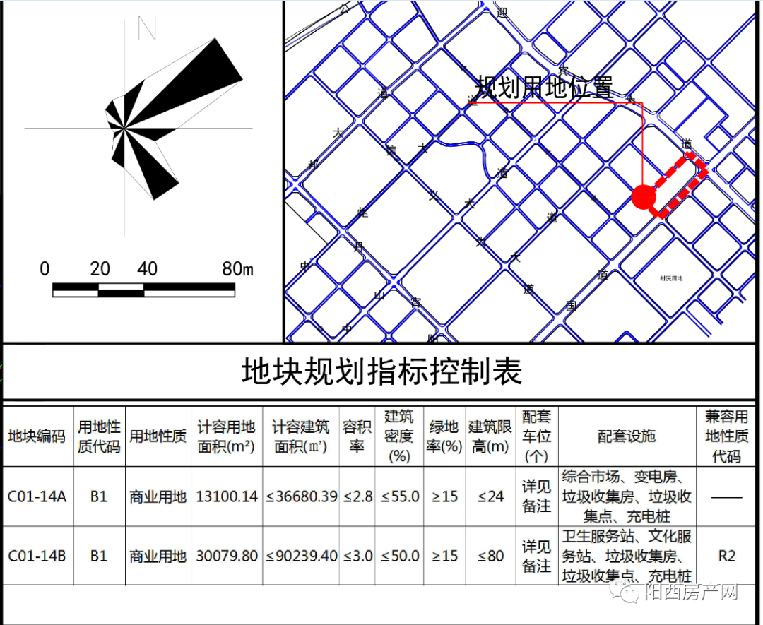C01-14B地块用地面积约为30079.8㎡,用地性质为商业用地B1,兼容二类居住用地R2,计容建筑面积≤90239.40㎡,容积率≤3.0,建筑密度≤50%,绿地率≥15%,建筑限高80米,配套设施卫生服务站、文化服务站、垃圾收集房、垃圾收集点、充电桩。