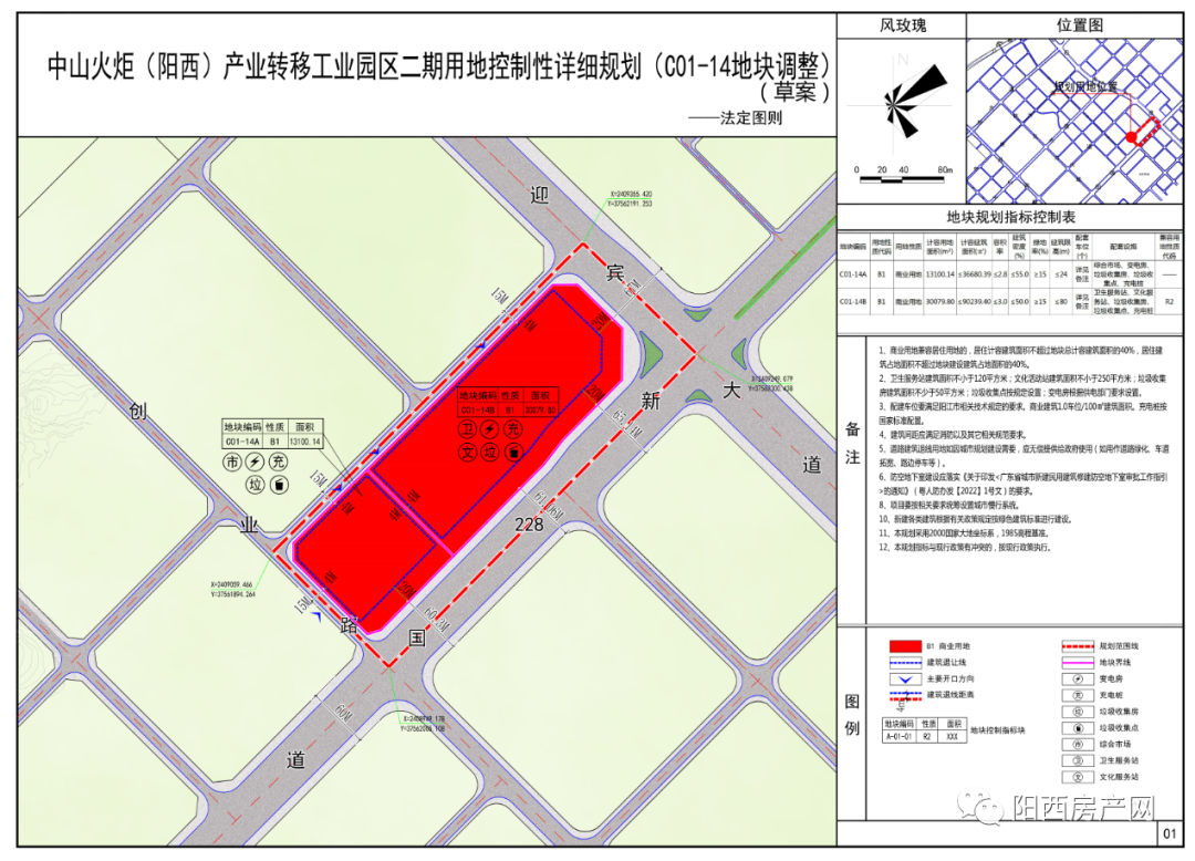 主要图纸:《中山火炬(阳西)产业转移工业园区二期用地控制性详细规划(C01-14地块调整)》(草案)管理图则。