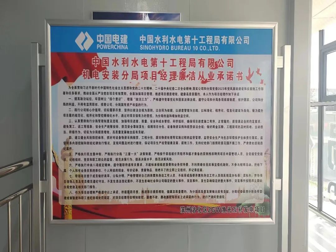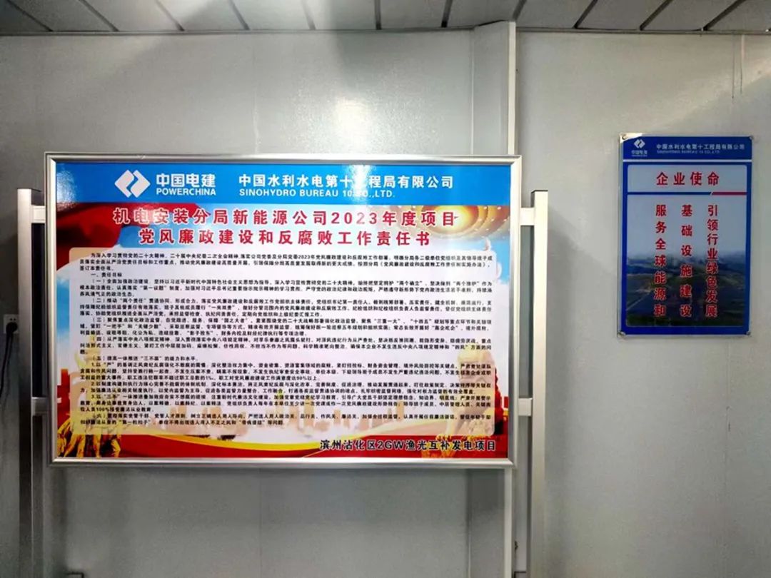 机电安装分局新能源公司滨州沾化区2吉瓦渔光互补发电项目组自建成以来,将廉洁要求贯穿于日常教育监督管理之中,深入贯彻公司纪委和分局纪委推进廉洁文化“四必进”“五融入”“三创建”,项目部按照公司纪委《关于开展廉洁文化“三创建”的实施方案》要求,组织开展了“廉洁示范项目”建设,大力推进廉洁文化建设走深走实,为分局高质量履约提供可靠的廉洁保障。