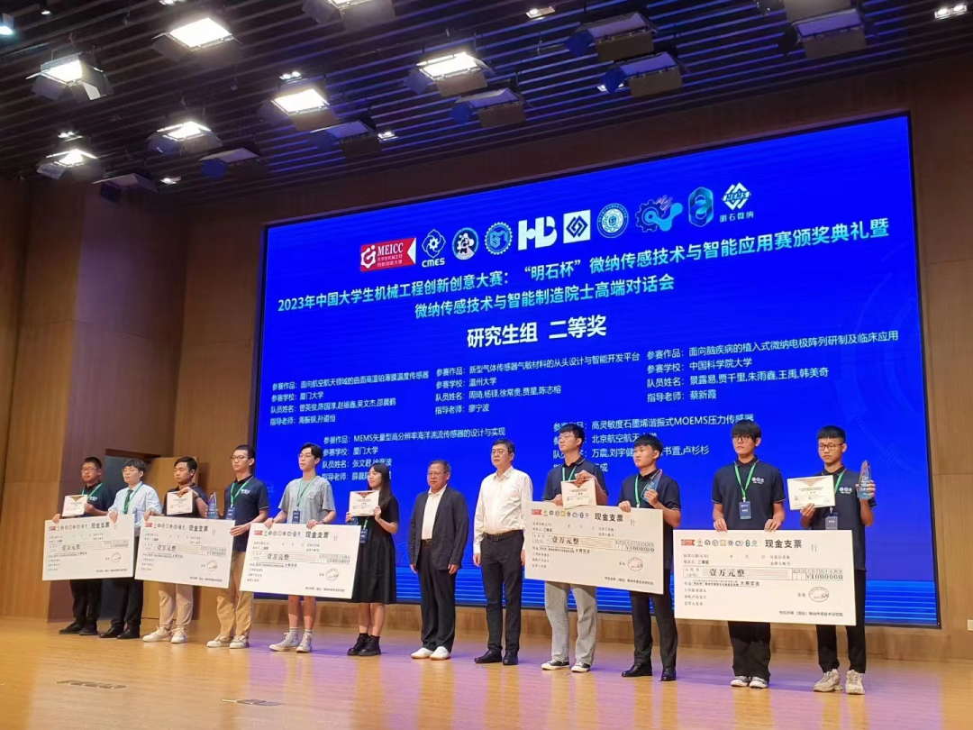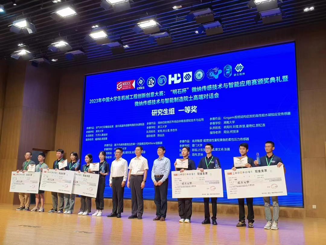 本届赛事自今年2月14日正式启动后,共有全国98所高校的373支团队,约1800人报名参赛。经过决赛答辩,我院周伟、罗涛老师指导,陈锐、计东生、王锦成、章文卓、张晨等同学参加的项目“高灵敏度·超宽线性量程兼备的柔性压力传感器”获得研究生组一等奖。海振银、孙道恒老师指导,曾英俊、陈国淳、赵福鑫、吴文杰、邵晨鹤等同学参加的项目“面向航空航天领域的曲面高温铂薄膜温度传感器”,和薛晨阳、张增星老师指导,张文君、徐彦波等同学参加的项目“MEMS矢量型高分辨率海洋湍流传感器的设计与实现”获得研究生组二等奖。