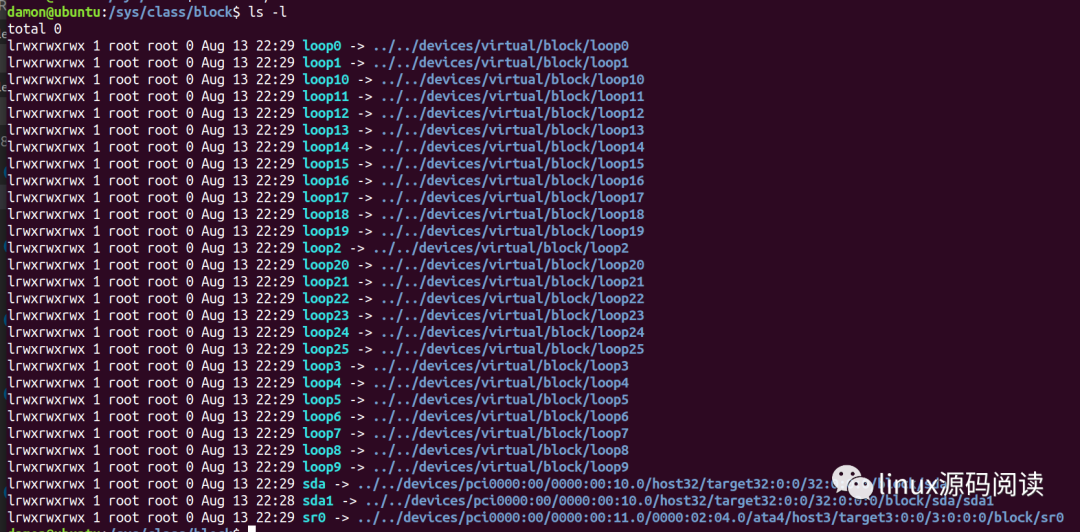 可以看到block目录下的所有文件都是链接文件,且都是/sys/devices/目录中的设备的超链接。